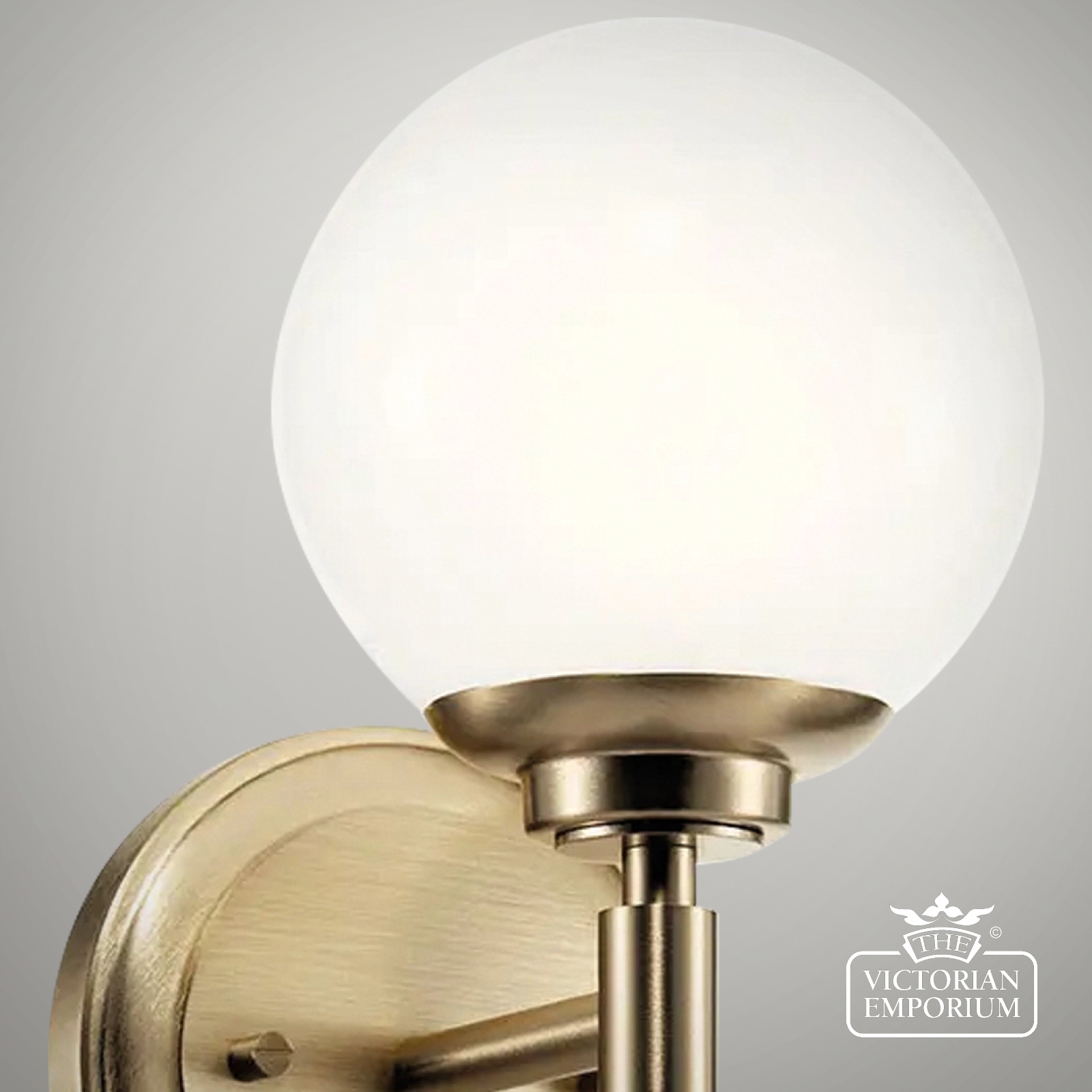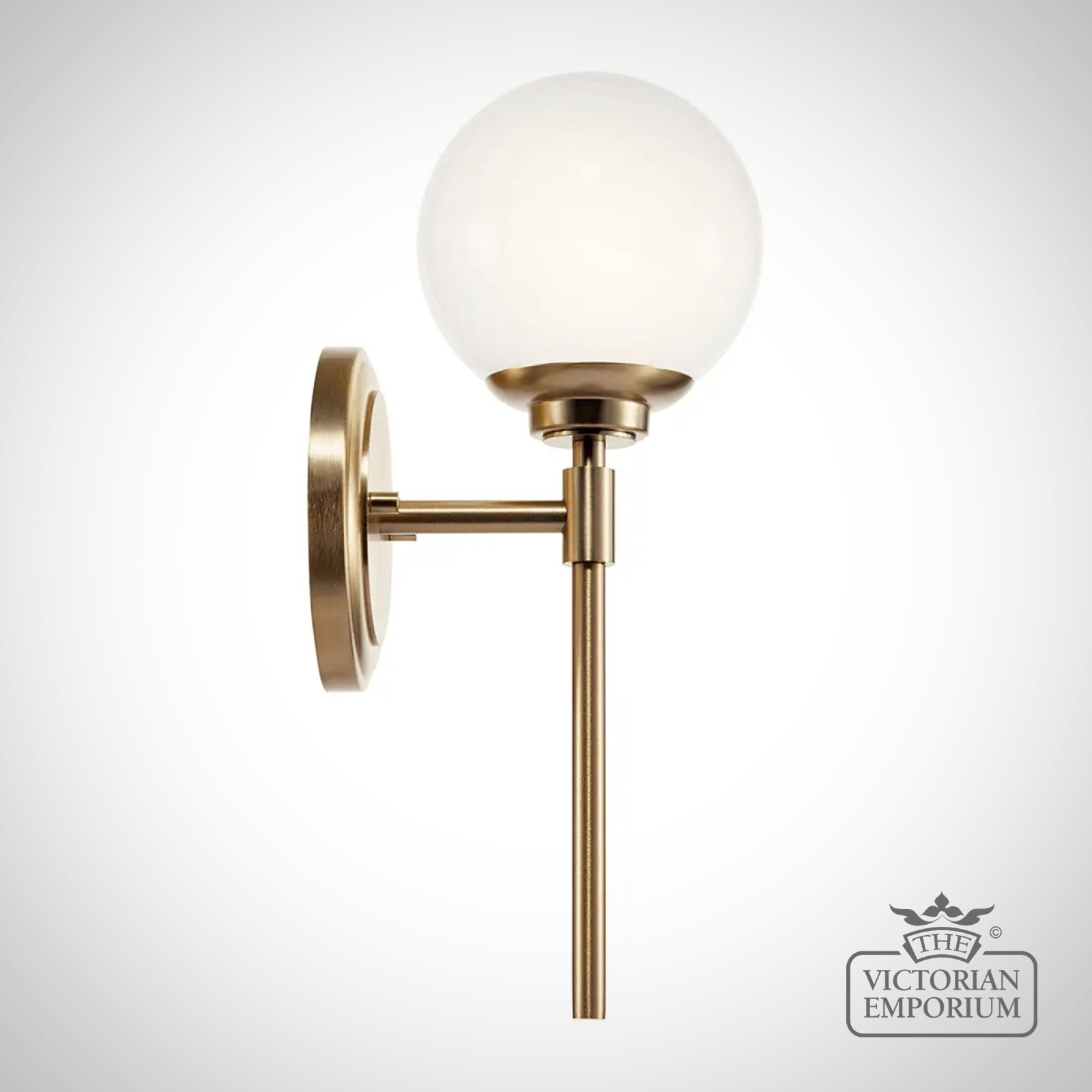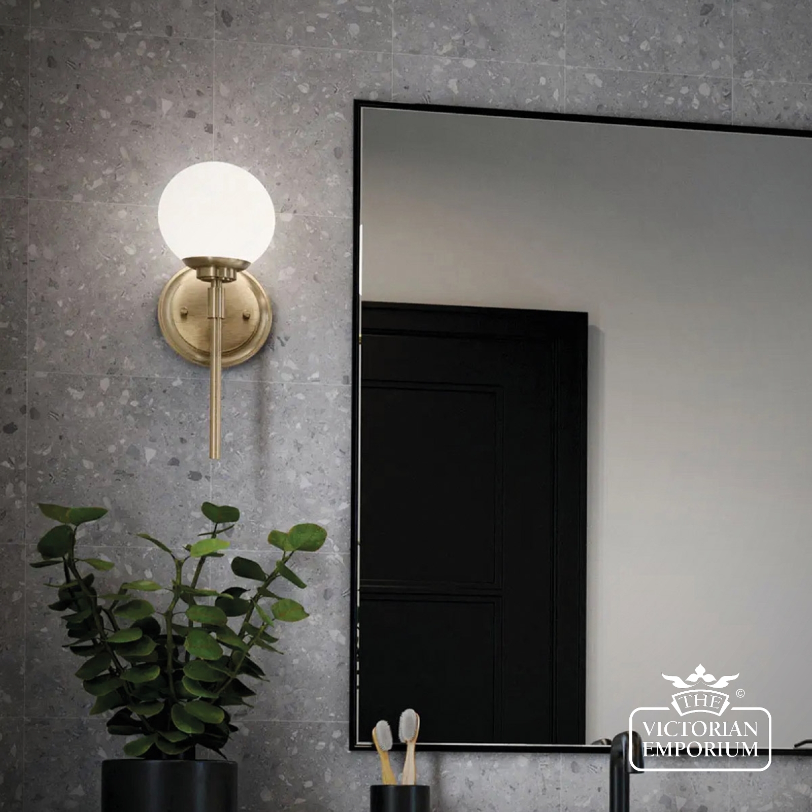 The Benno wall light features a classic globe in milky white opal glass and can be mounted facing up or down. Clean details highlight its mixed elegant finishes. IP44 rated for bathrooms.
