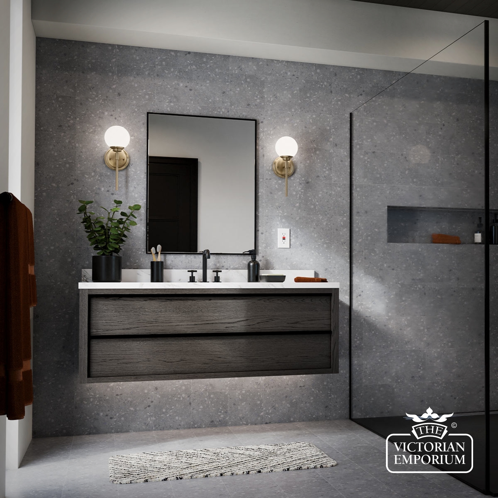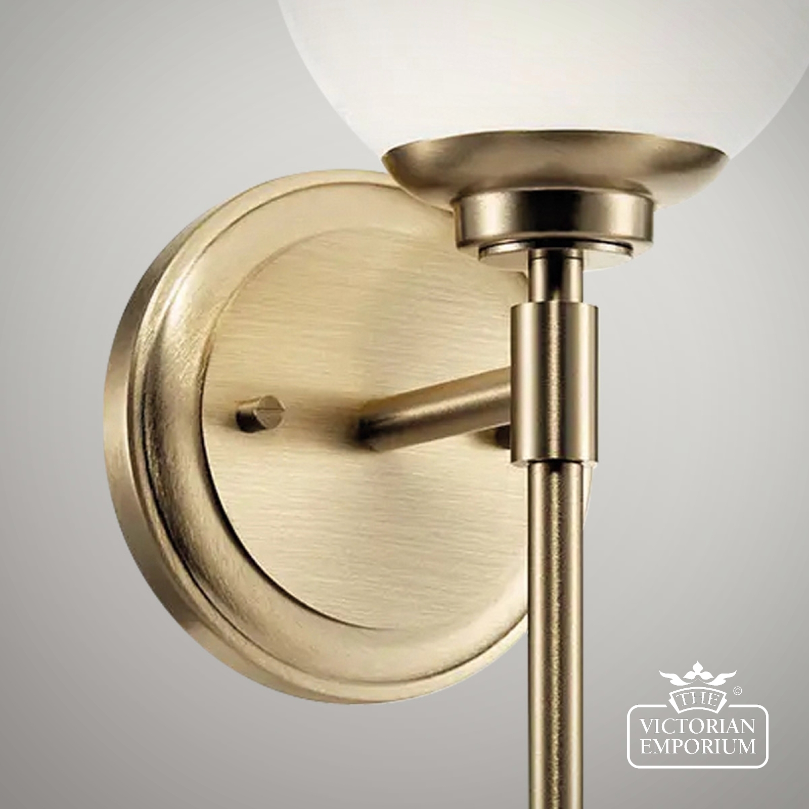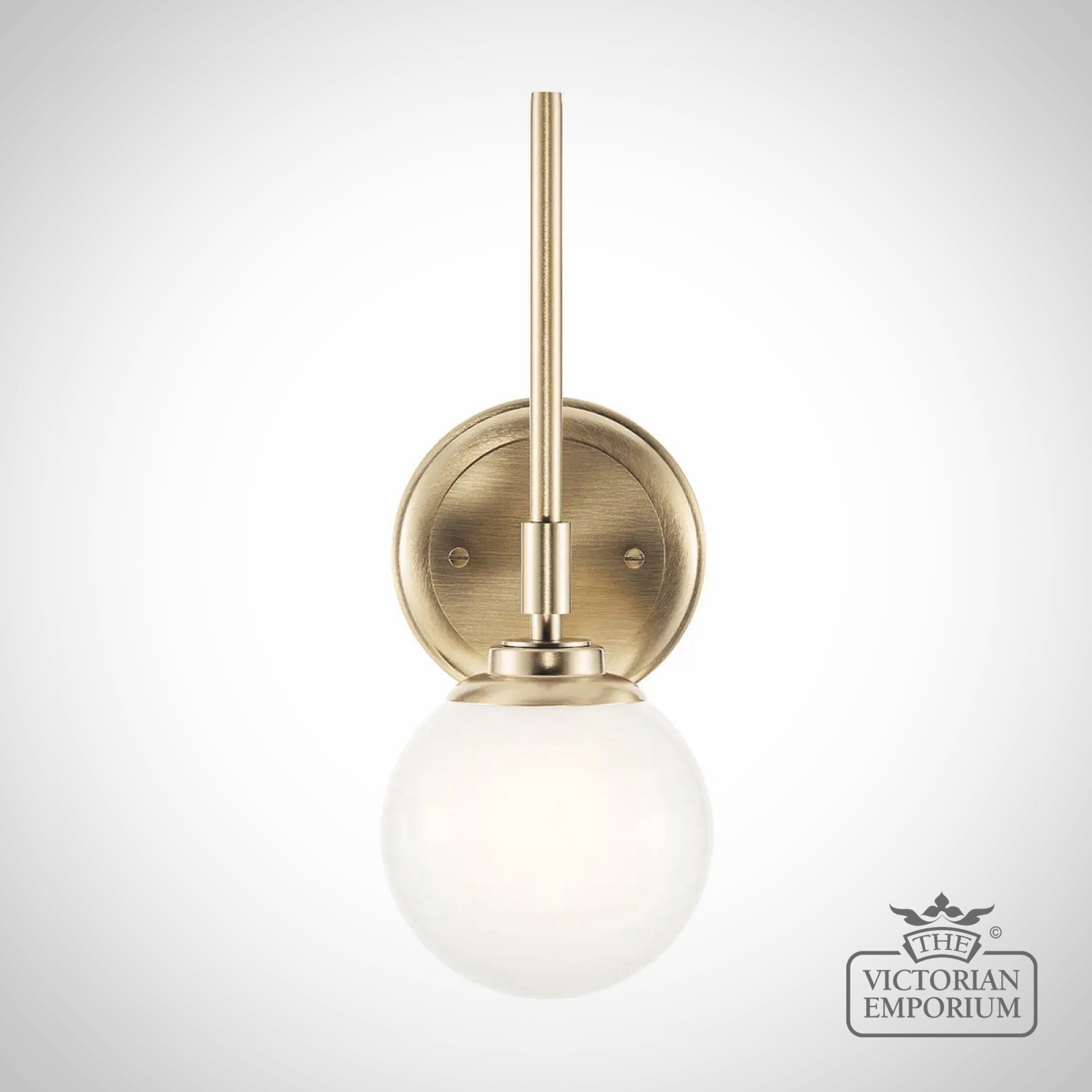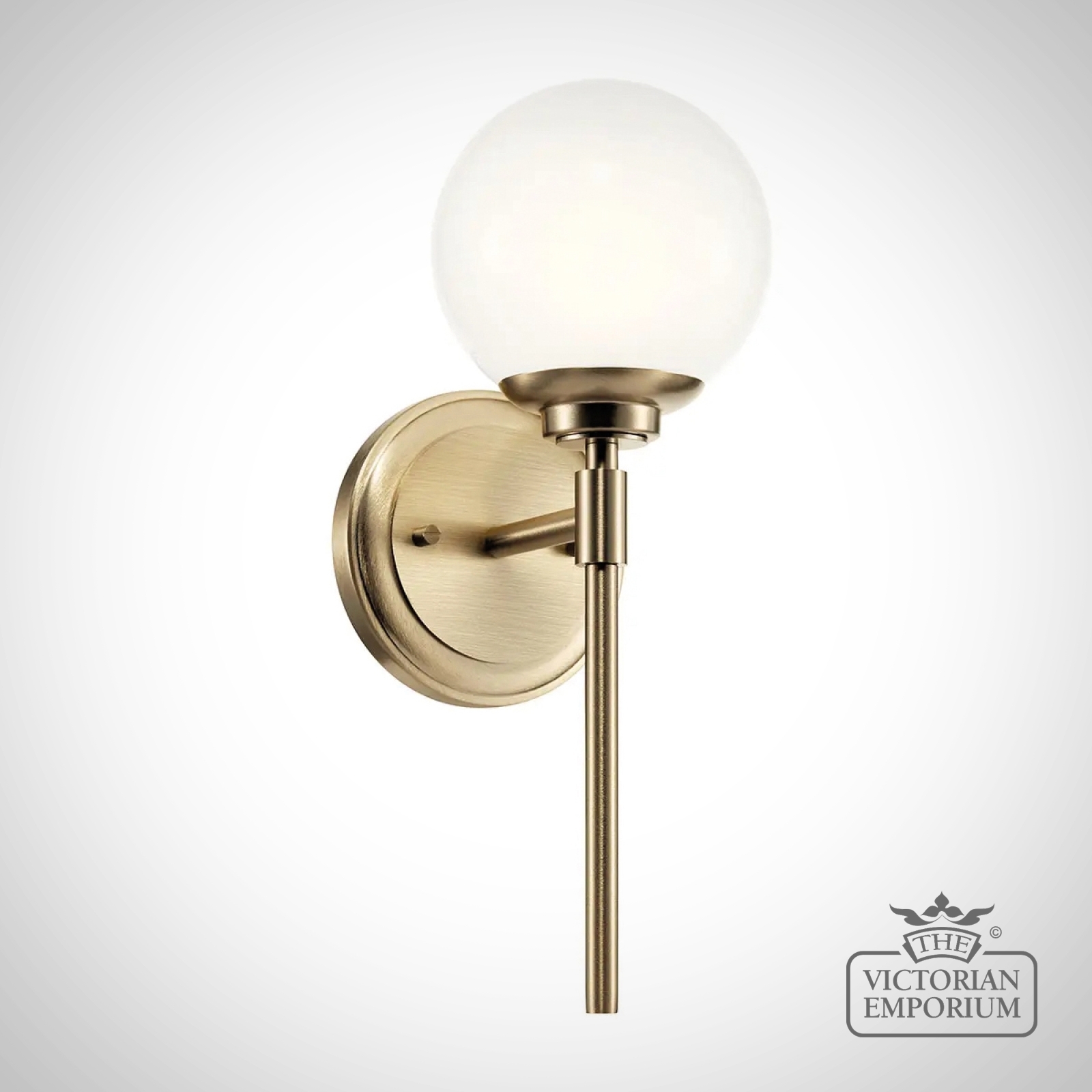 The Benno wall light features a classic globe in milky white opal glass and can be mounted facing up or down. Clean details highlight its mixed elegant finishes. IP44 rated for bathrooms.