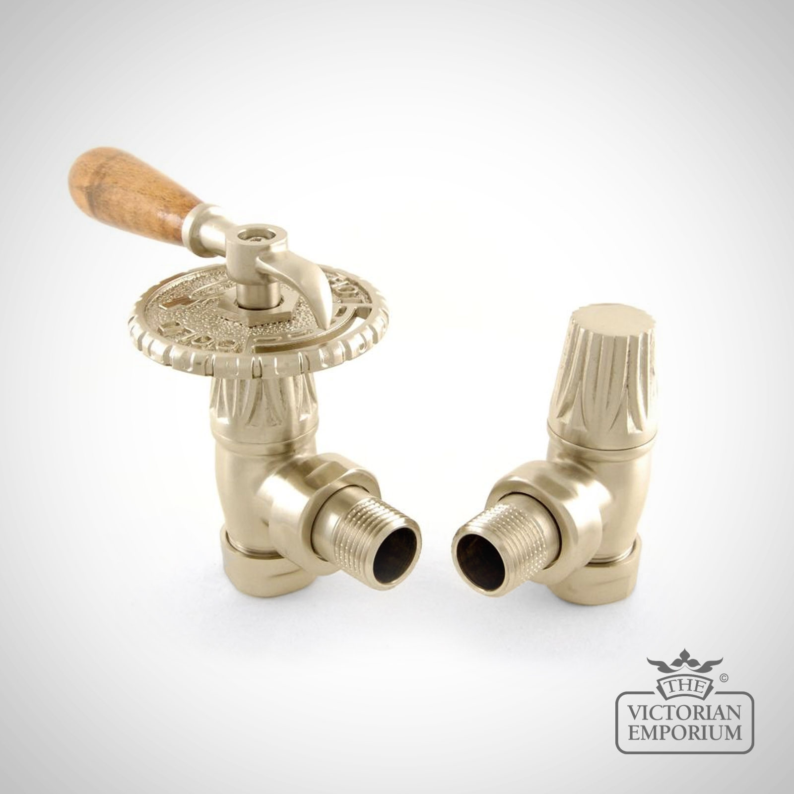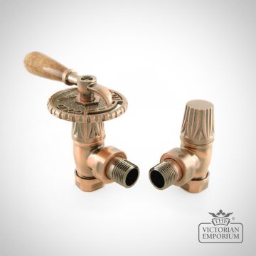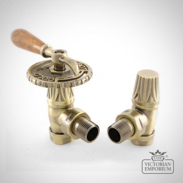 A traditional lever style manual radiator valve that comes as complete pairing of one lock-shield valve and a one wheel-head valve (lock-shields are essential for maintaining proper balance across a heating sytem). The decorative dial is controlled by a wooden lever handle and can be fully adjusted with just a quarter turn.