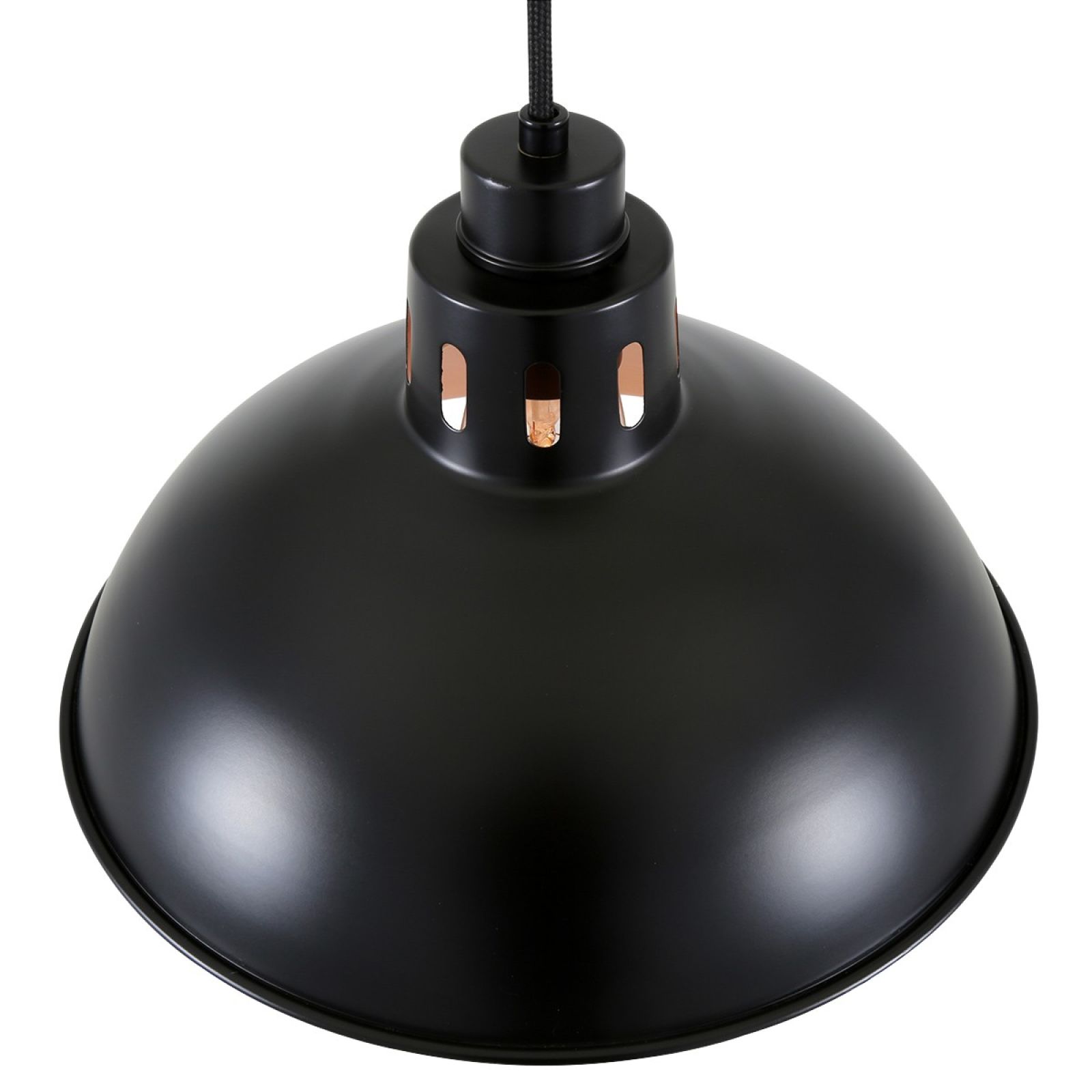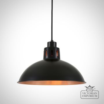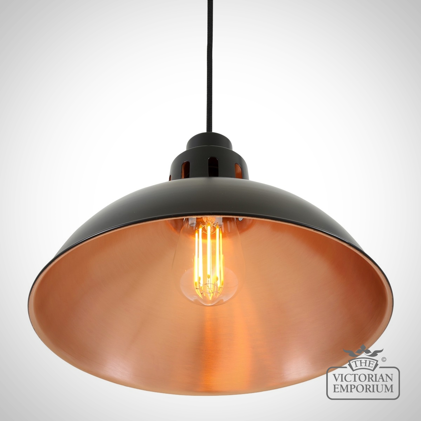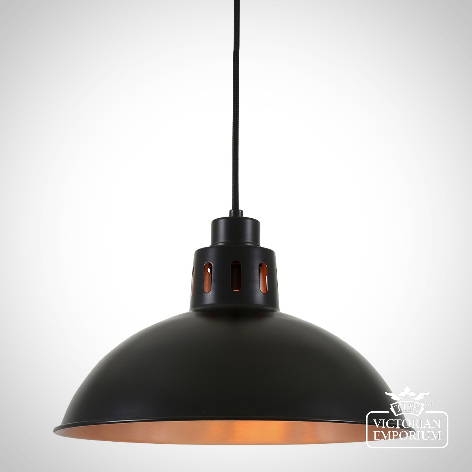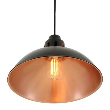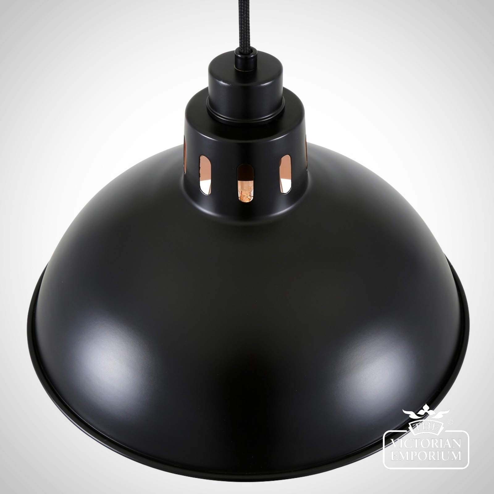 Black on top and with a brushed copper interior to enhance the glow of Edison bulbs (sold separately)