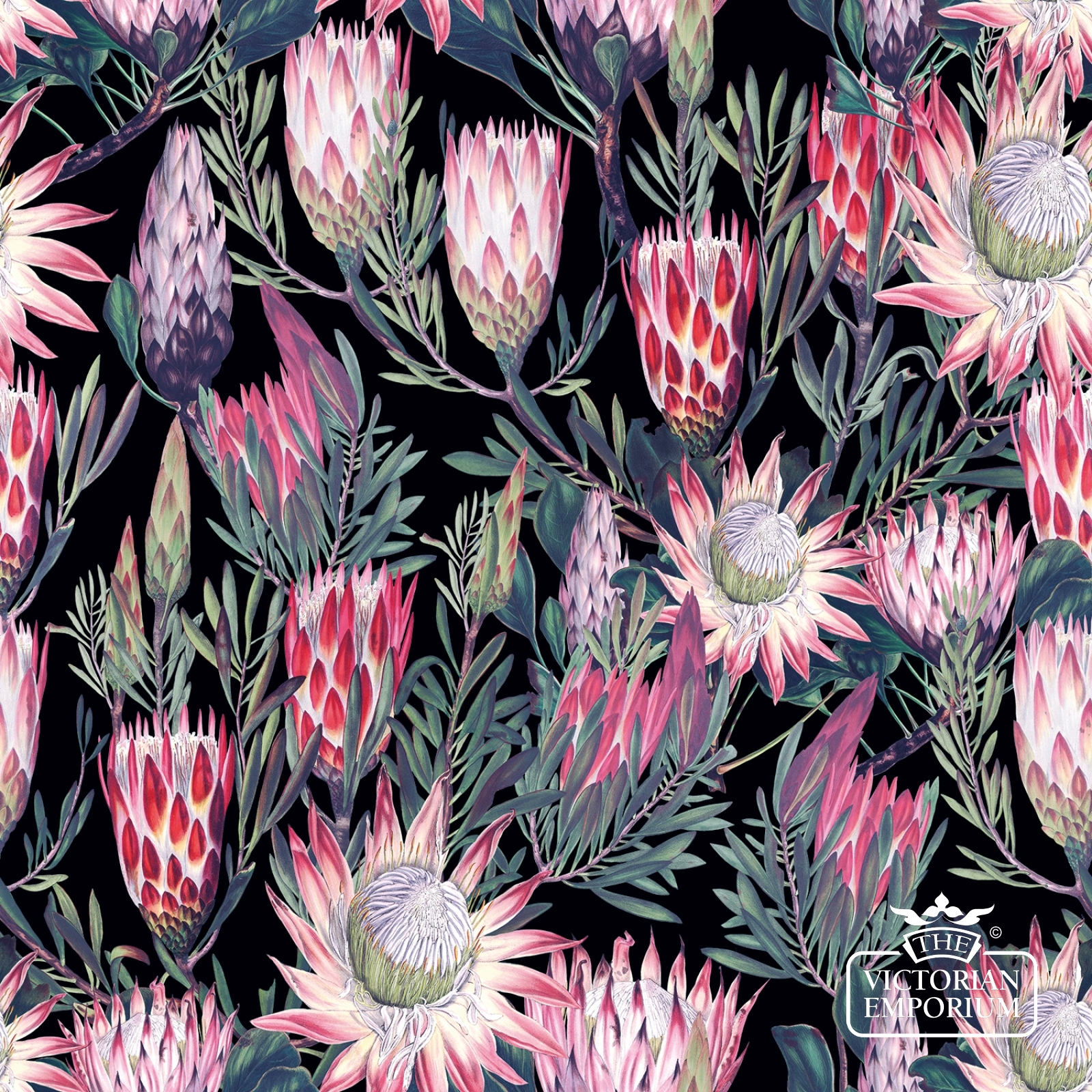 A really stunning fabric from the Tropical Velvets collection featuring exotic pink and white flowers on an ebony background.