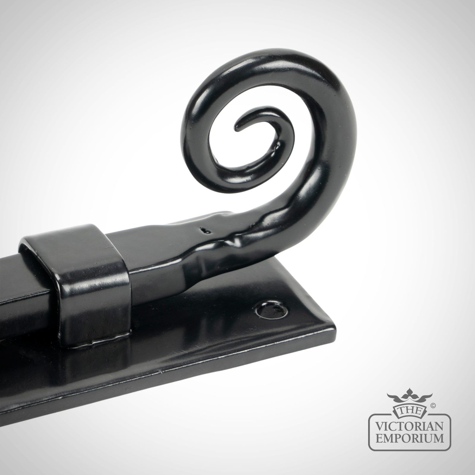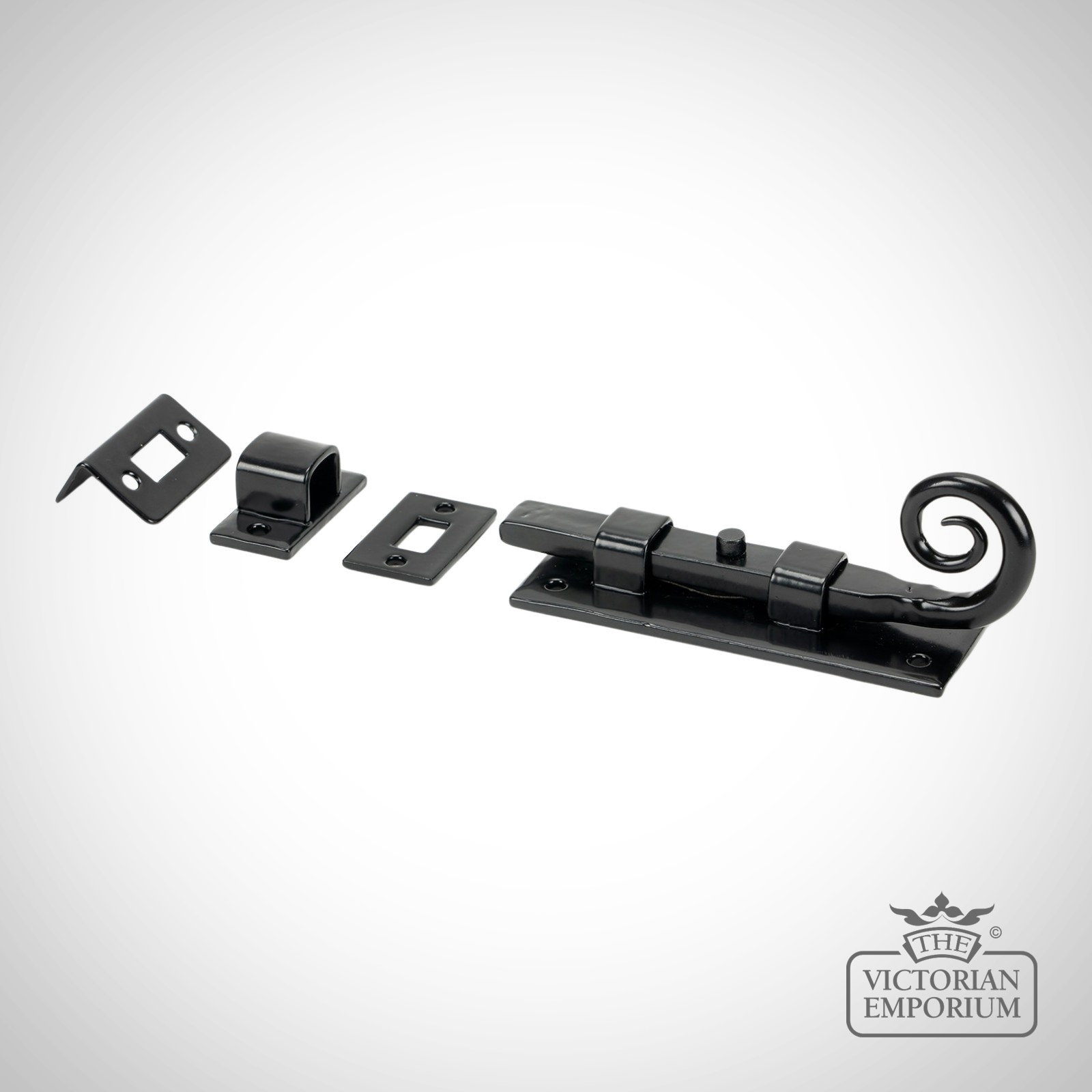 A black monkeytail bolt which can be used on windows or doors and in other applications due to a variety of keeps supplied with the product.