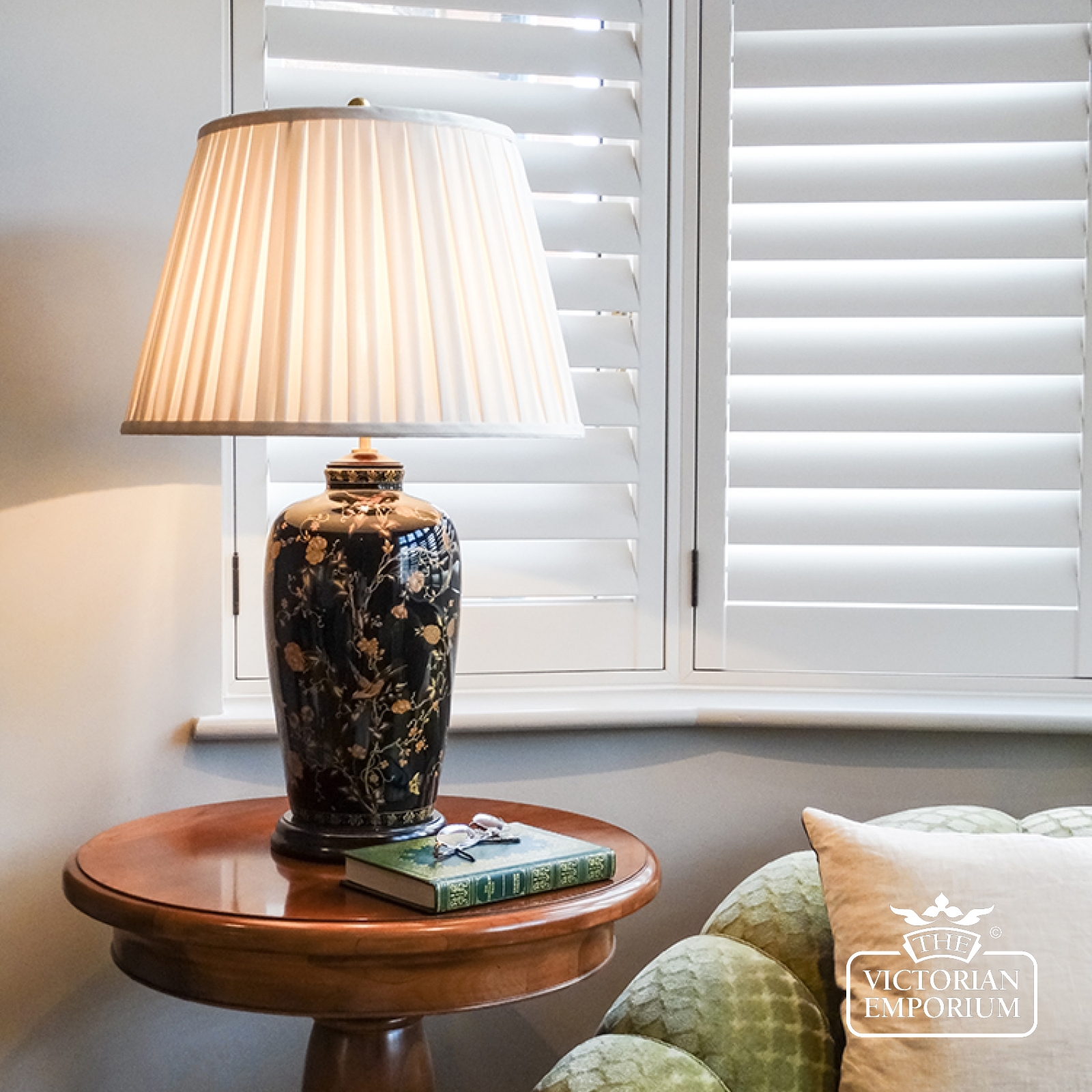 Chinese Porcelain table lamp with a traditional Gold Birds pattern over a Black glaze. Fitted with a wooden base, Cream polycotton box pleat shade, and Aged Brass finial.