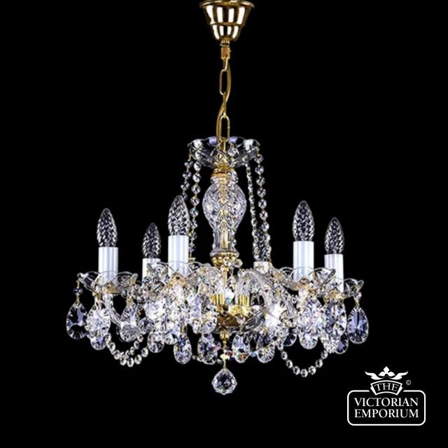 Suitable for small/medium sized rooms & standard height ceilings. Chandelier shown above in the gold finish.