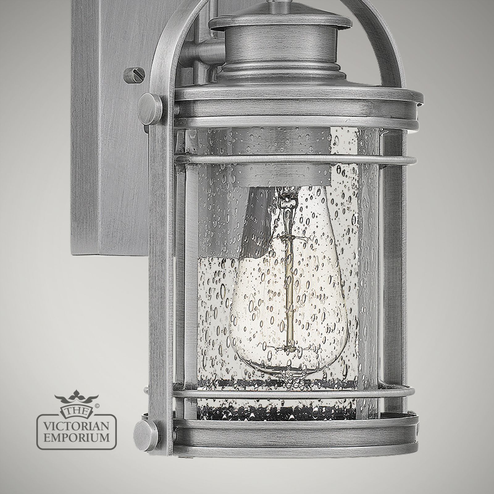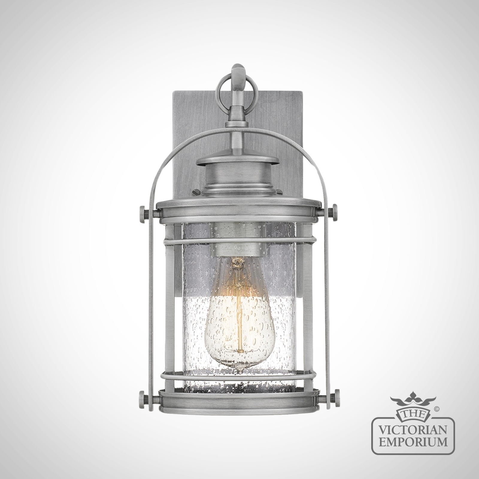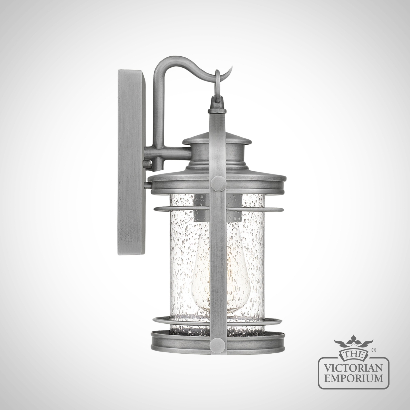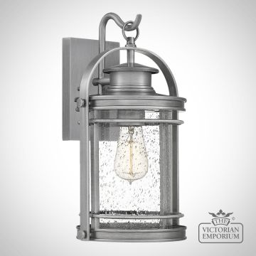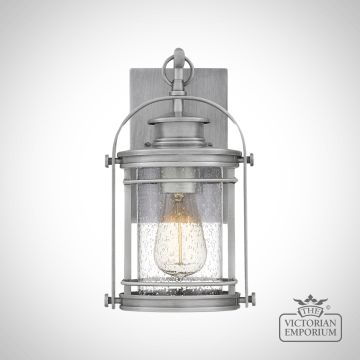 This light features a strong construction with industrial-grade aluminium. Vintage style bulbs are recommended for this fitting. A really attractive range of outdoor lights incorporating wall lights in two sizes, pendestal lanterns, and ceiling lights.