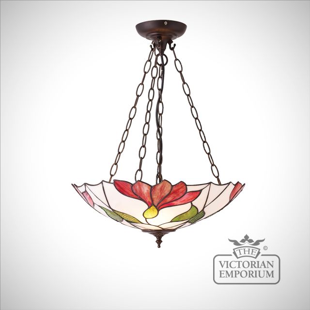 The Botanica inverted 3 light pendant combines a modern brightly coloured floral design, with a dark bronze effect fitting