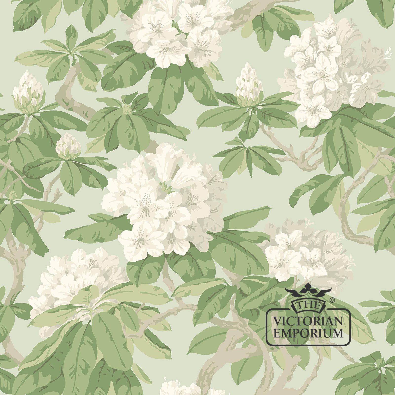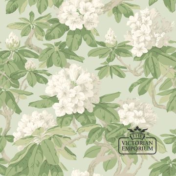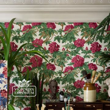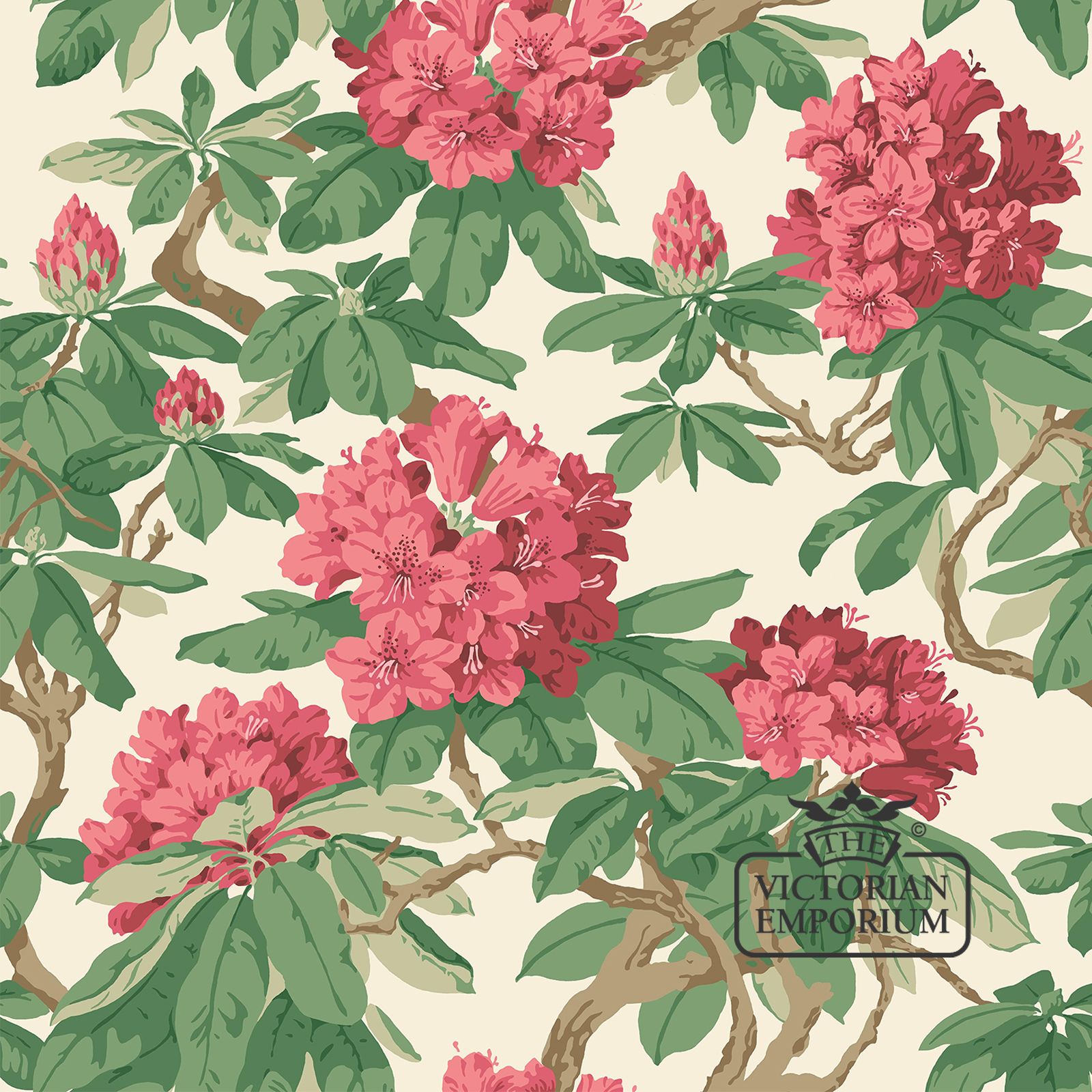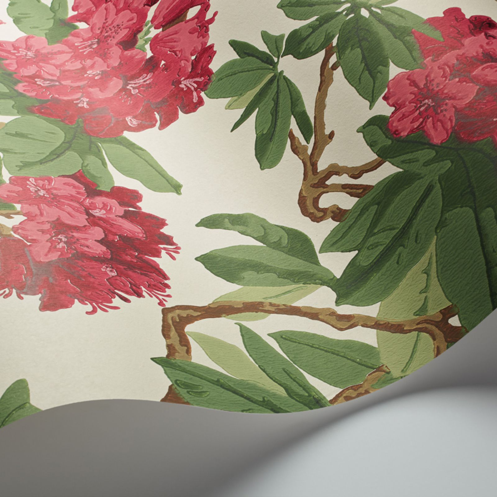 Featuring a stunning display of rhododendron blossoms in full bloom, this floral wallpaper design is influenced by the seventeenth century gardens of Chateau de la Bourlie in France. This floral design is available in four lovely colourways of ivory of duck egg and pale lemon, and coral and carmine on off white.