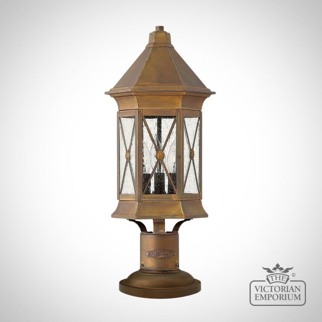 Regal design with solid brass construction. Triangular-shaped stamped window pattern with circular medallion accent - perfect for traditional garden lighting