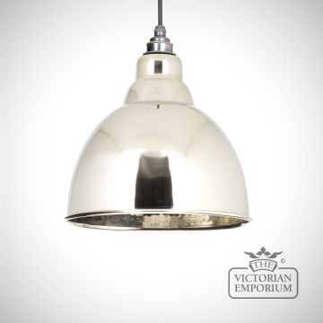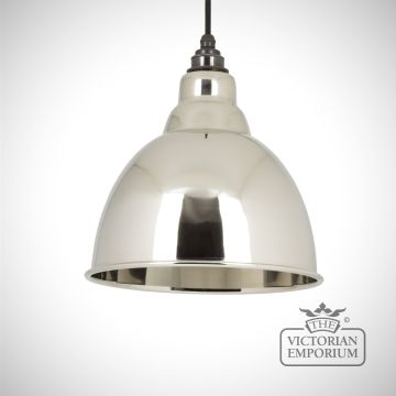 This pendant is hand spun from solid brass and finished in smooth nickel with a black fabric cable