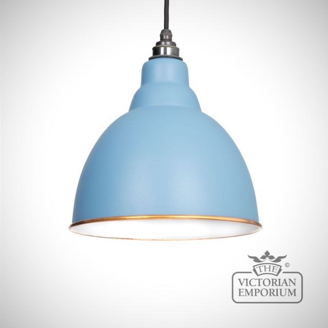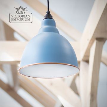 This pendant is hand spun from solid copper and finished in copper with a black fabric cable. This one is in a Matt Pale Blue exterior with a White Gloss interior