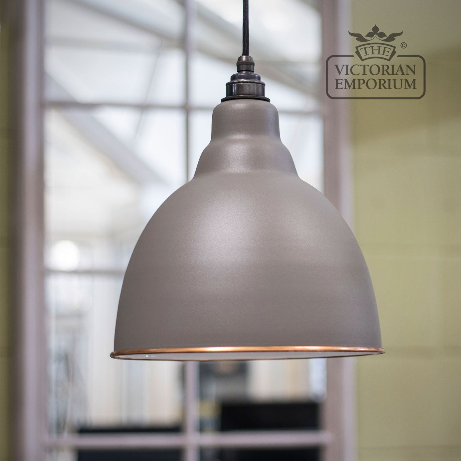 This pendant is hand spun from solid copper and finished in copper with a black fabric cable. This one is in a Matt Warm Grey exterior with a White Gloss interior