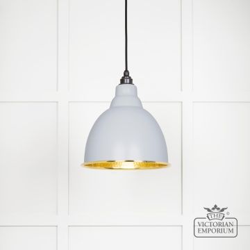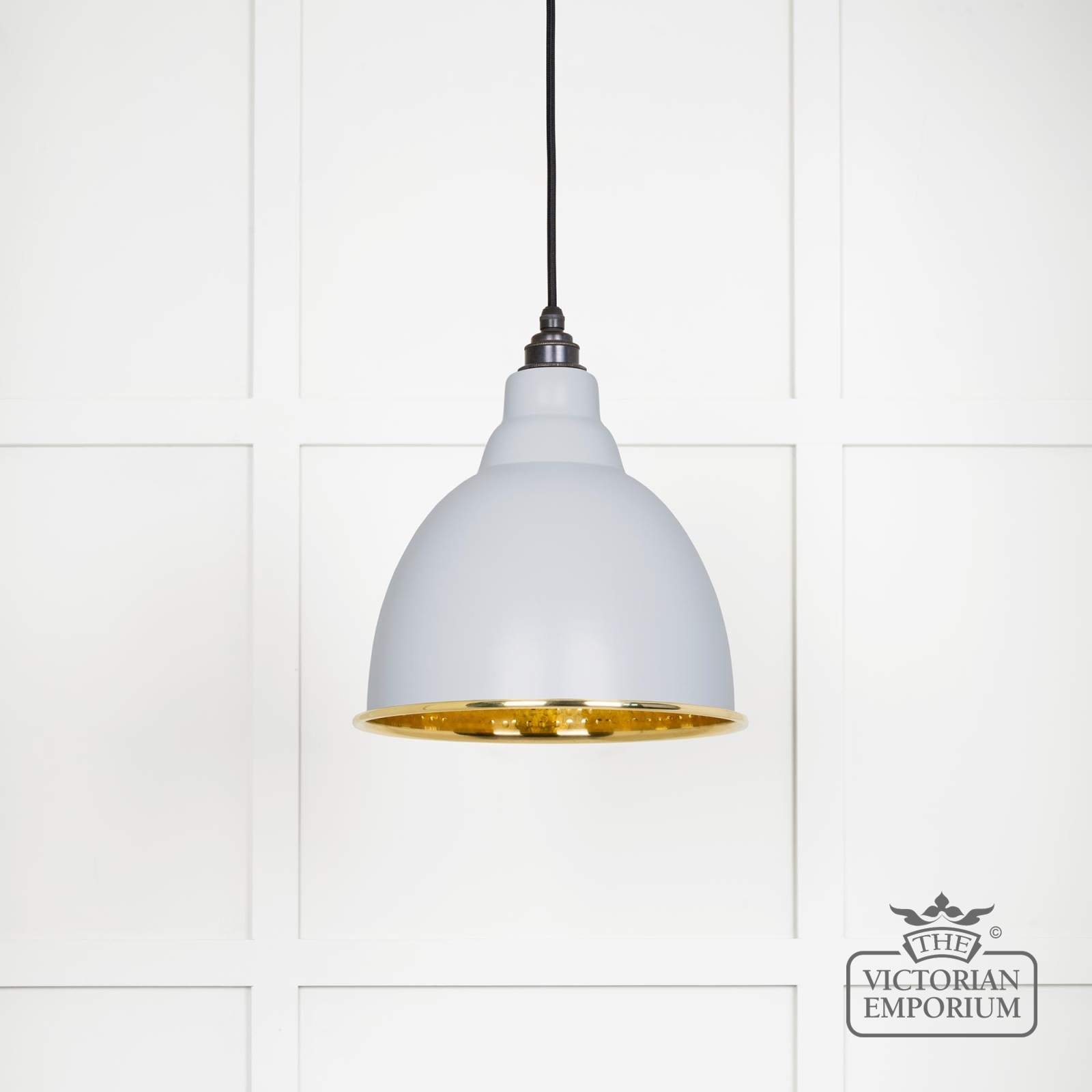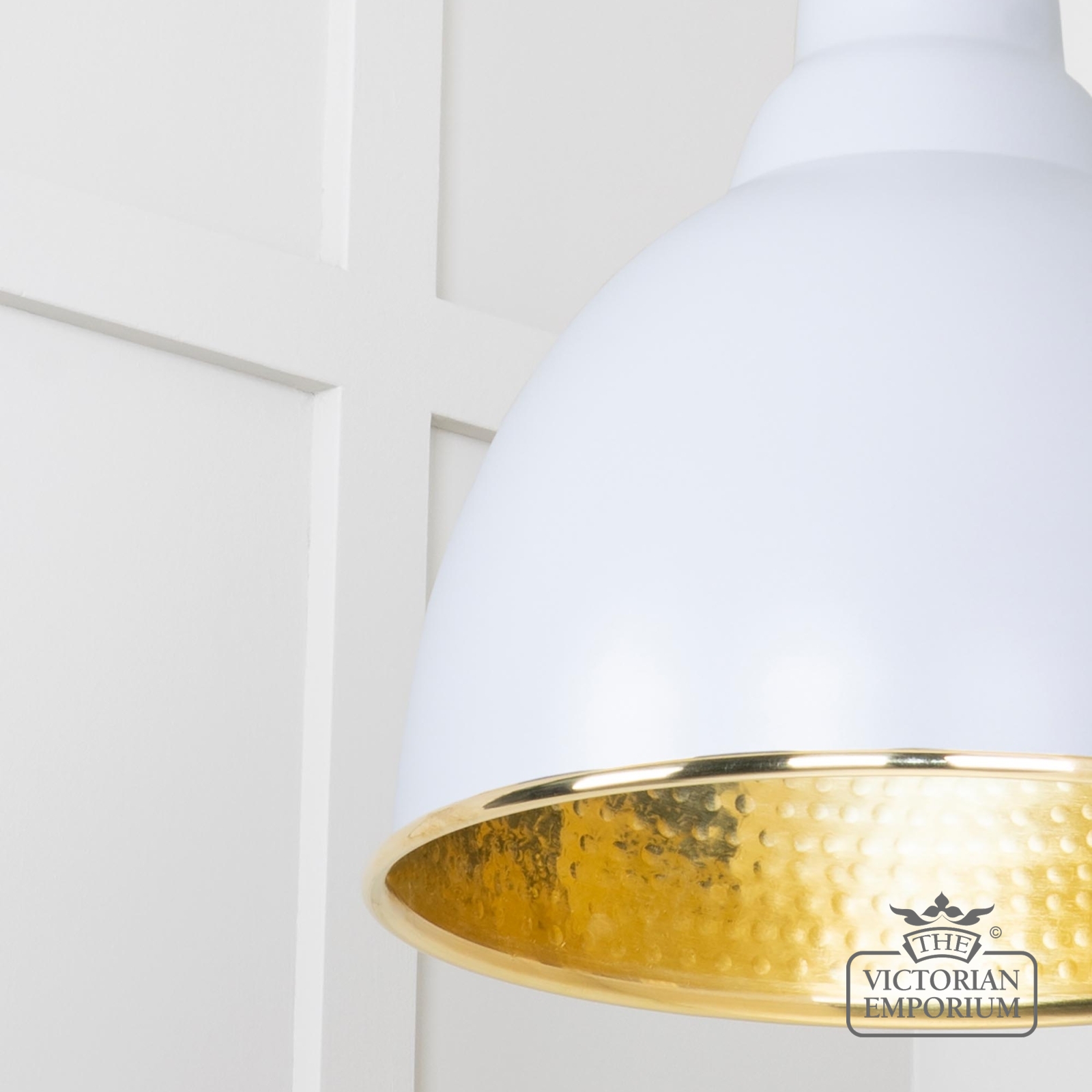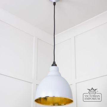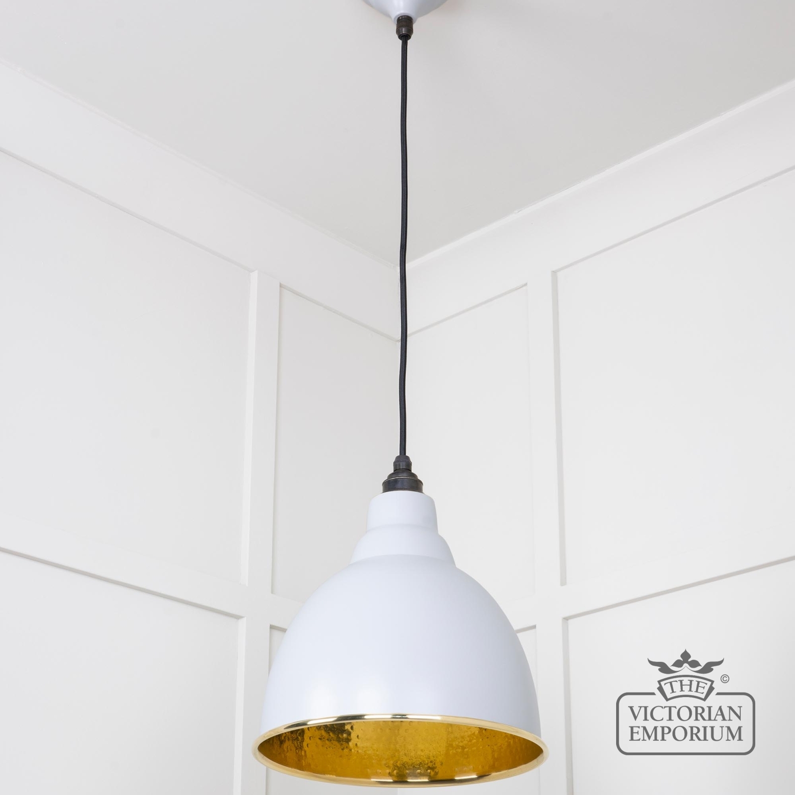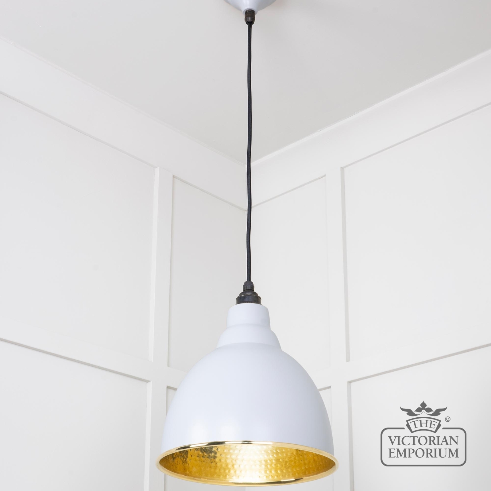 This pendant is hand spun from solid brass and finished in hammered brass and Birch painted exterior with a black fabric cable. This one has a beautiful hammered brass interior and a Birch exterior