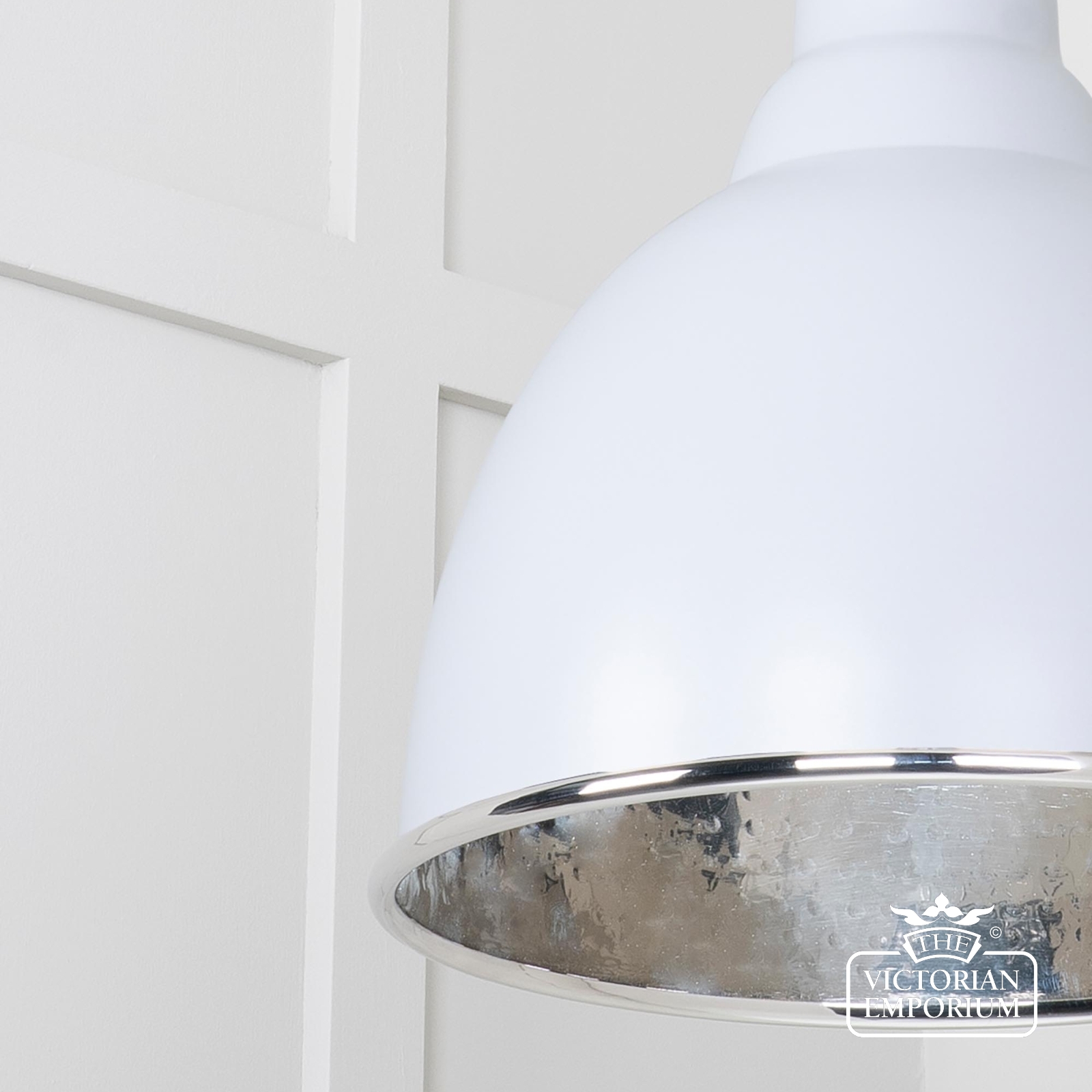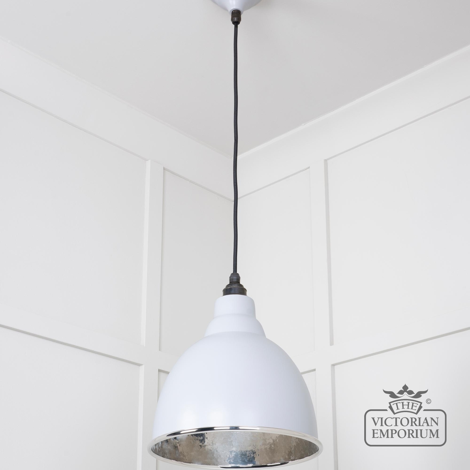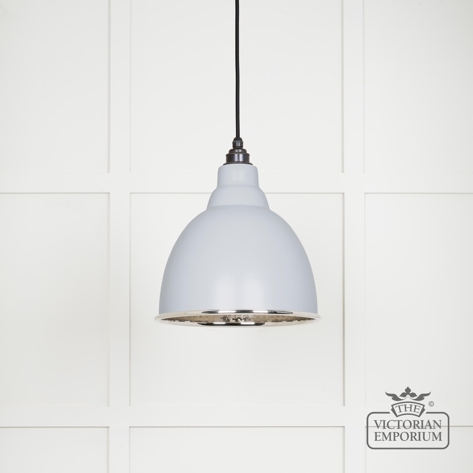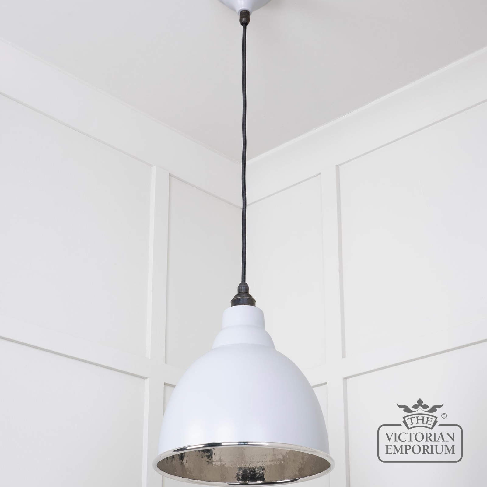 This pendant is hand spun from solid brass and finished in hammered nickel with a black fabric cable. This one has a hammered nickel interior and painted Birch exterior