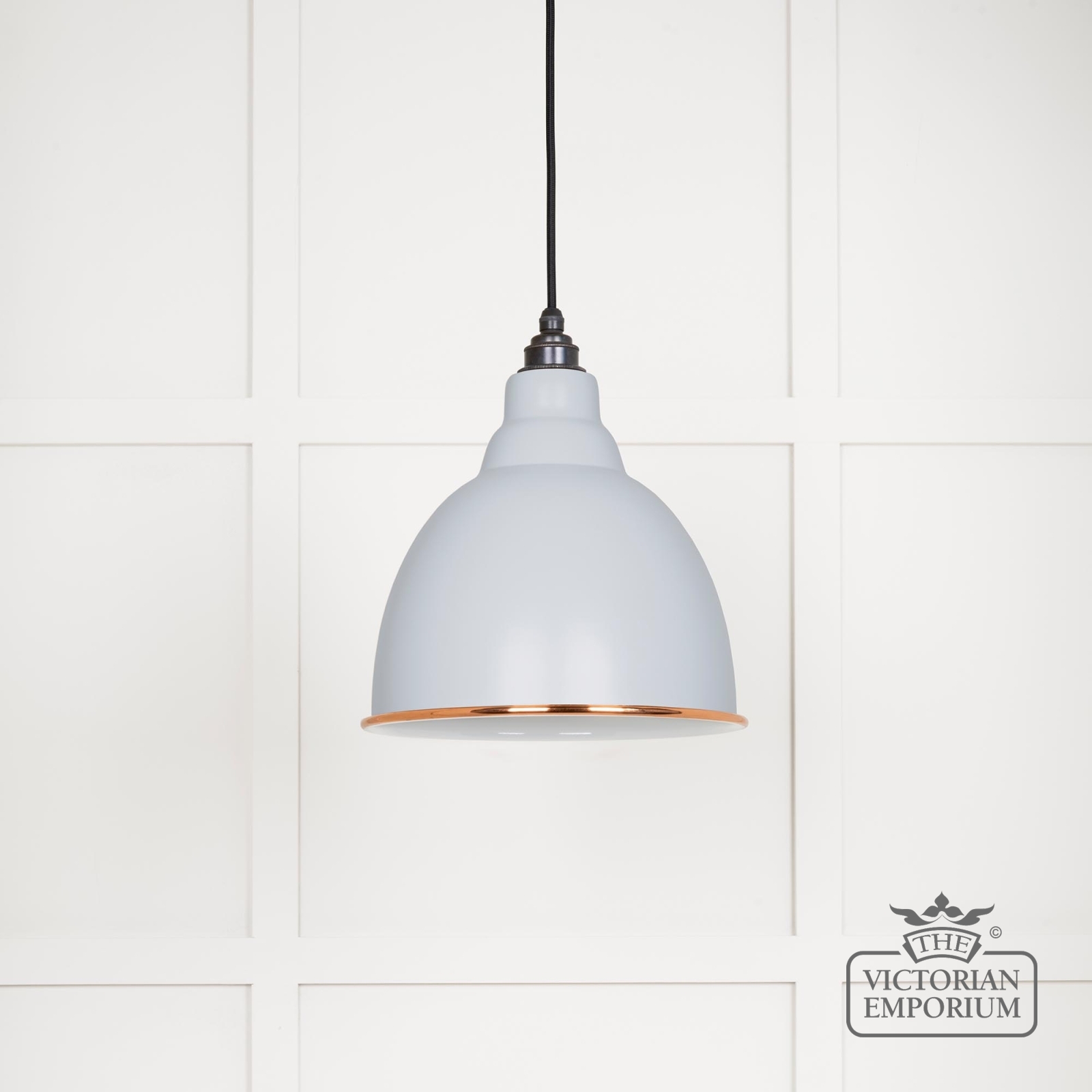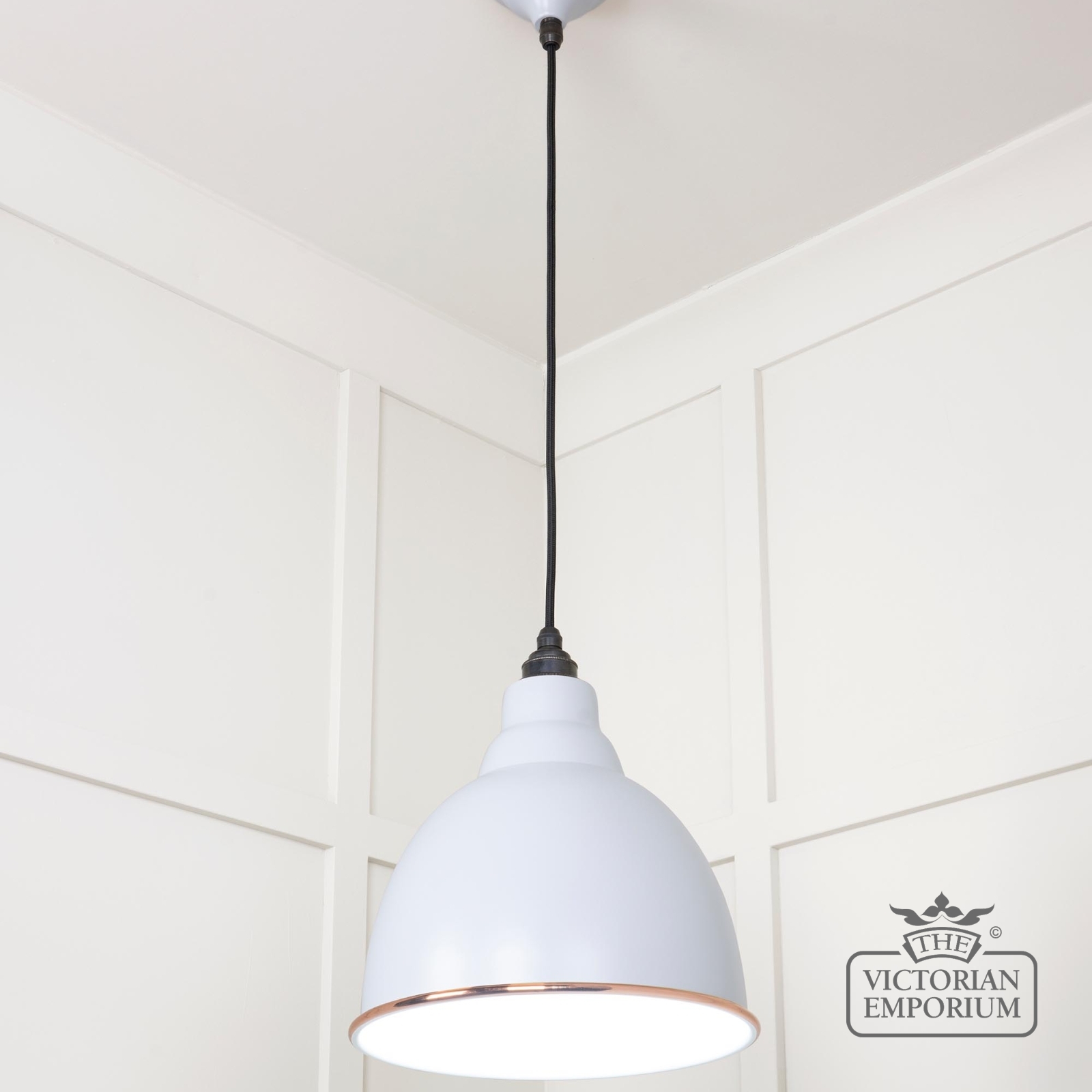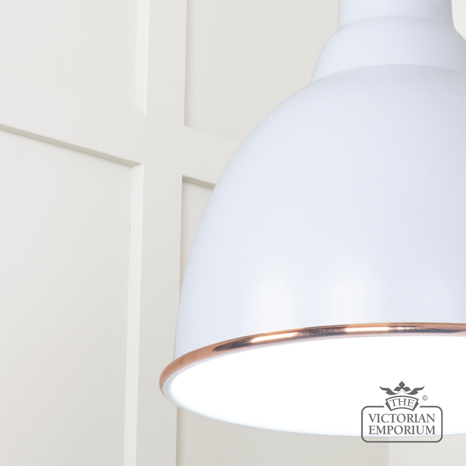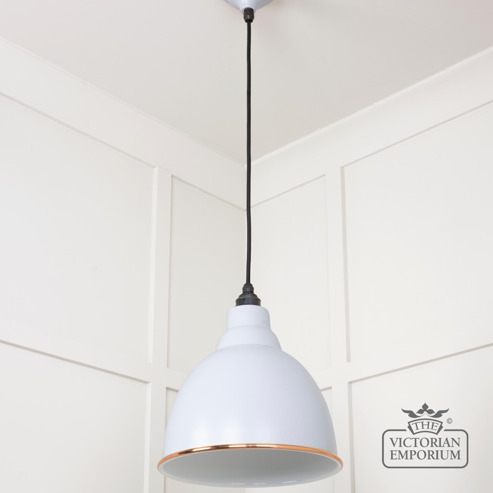 This pendant is hand spun from solid copper and finished in White Gloss and Birch paint with a black fabric cable. This one has a beautiful white gloss interior and Birch exterior