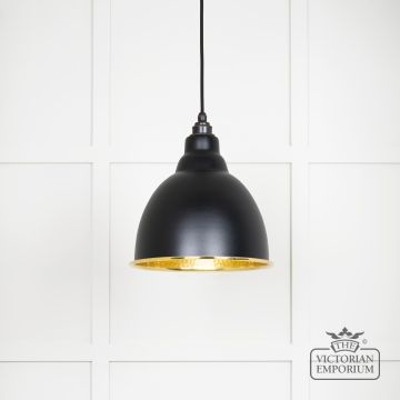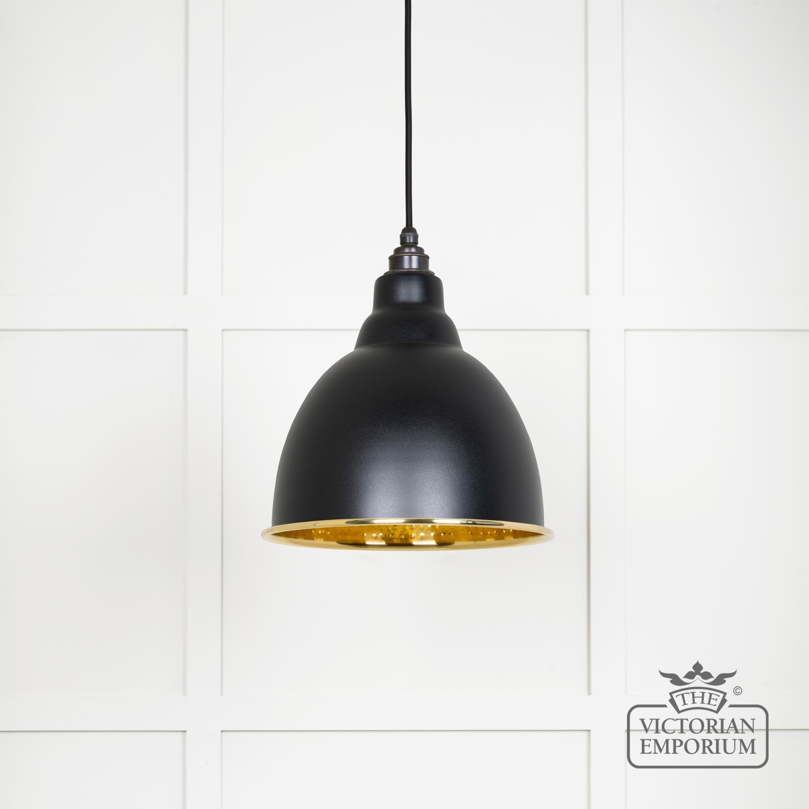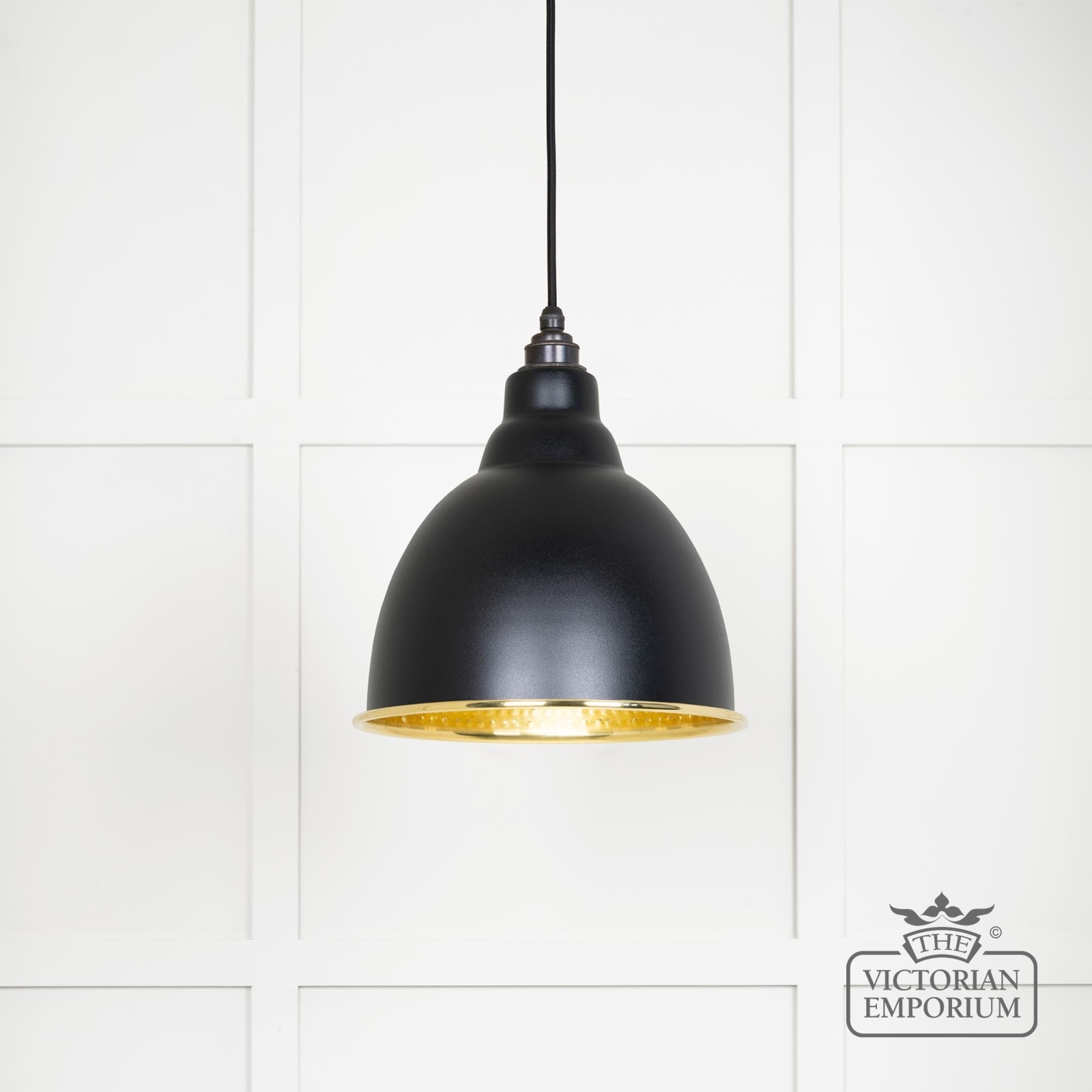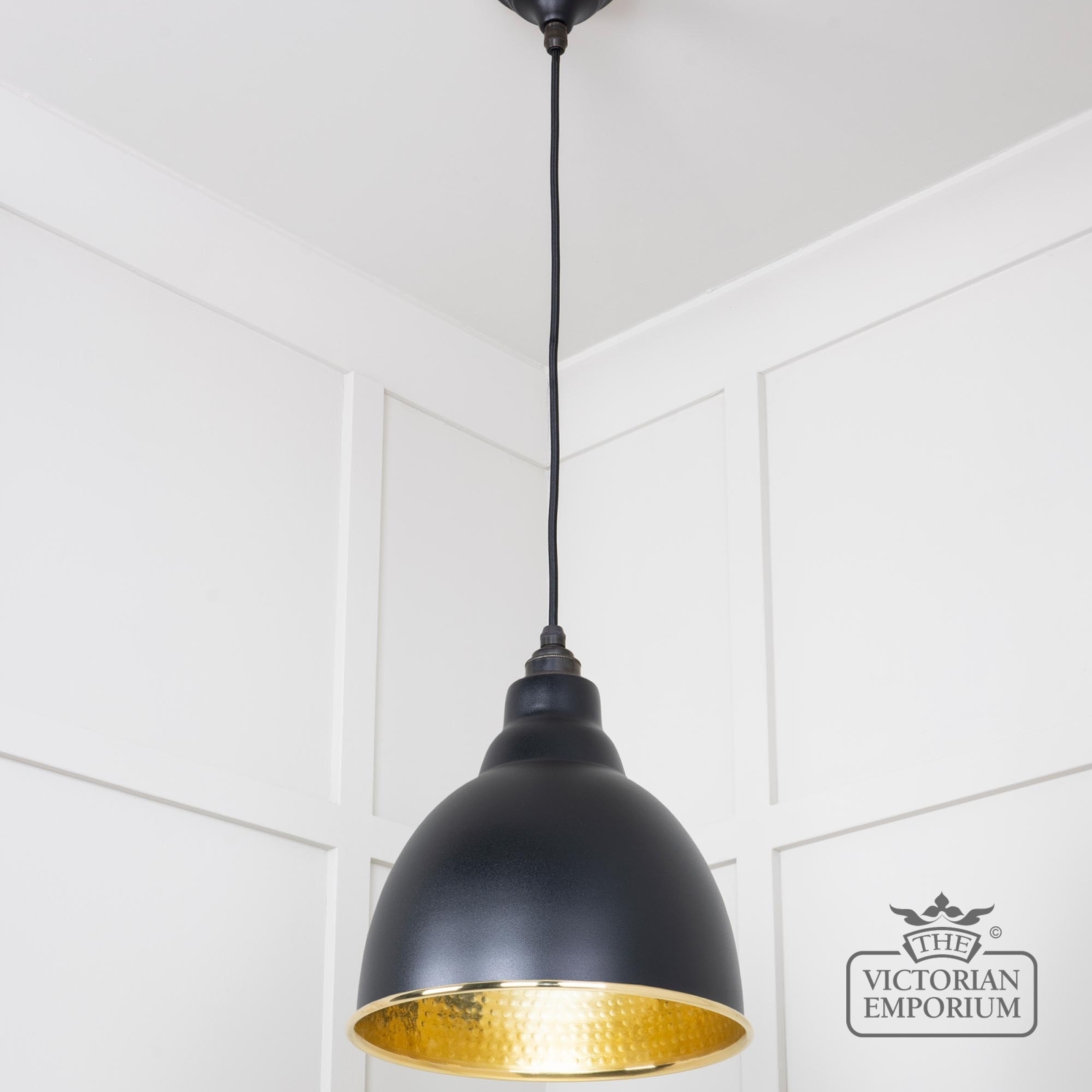 This pendant is hand spun from solid brass and finished in hammered brass and Black painted exterior with a black fabric cable. This one has a beautiful hammered brass interior and a Black exterior