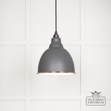 This pendant is hand spun from solid copper and finished in White Gloss and Bluff paint with a black fabric cable. This one has a beautiful white gloss interior and Bluff exterior