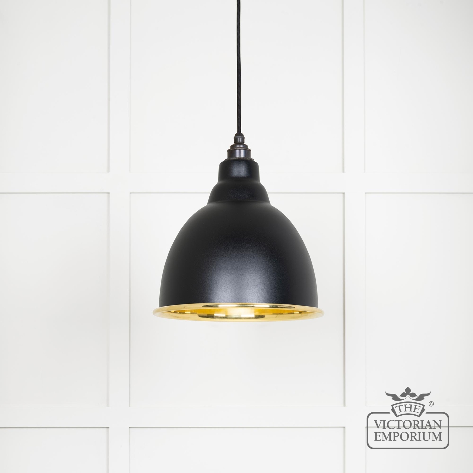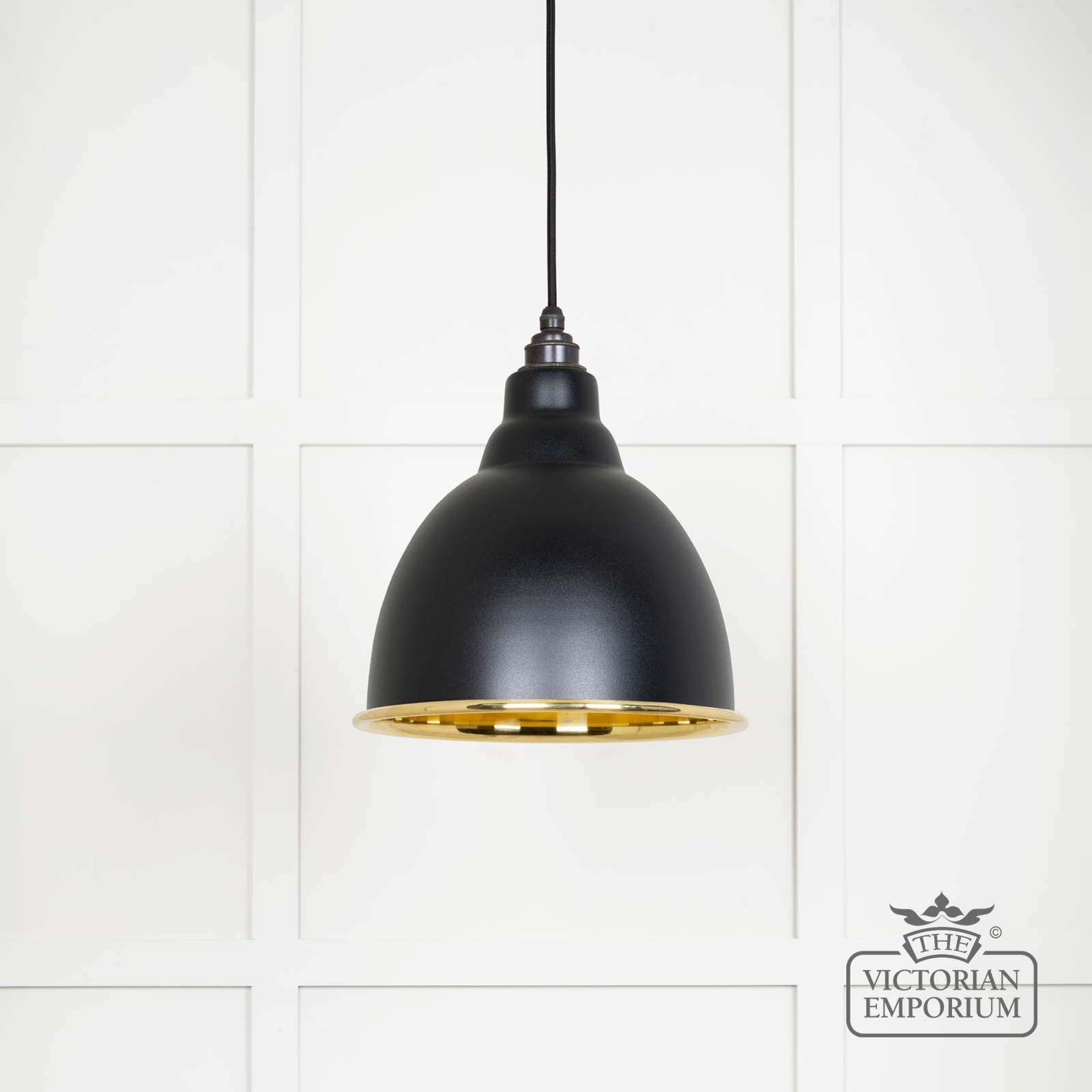 This pendant is hand spun from solid brass and finished in smooth brass with a black fabric cable. With a Black painted exterior.