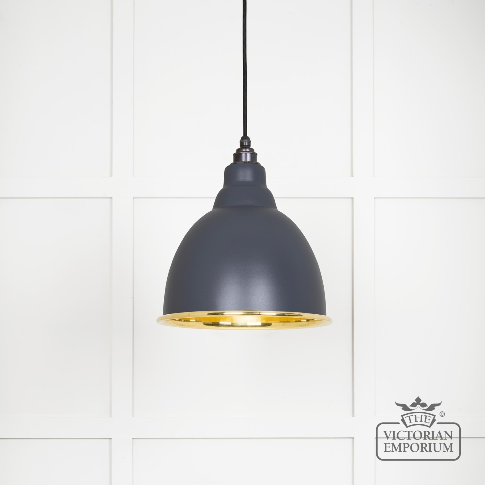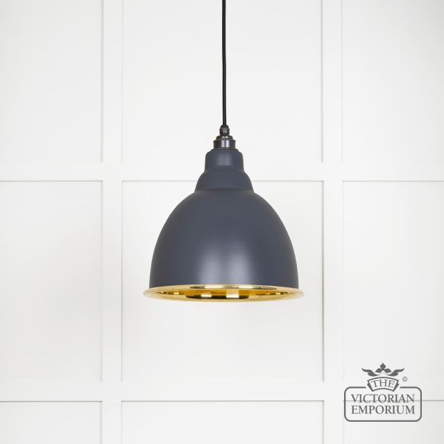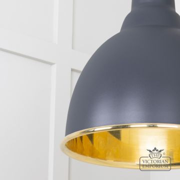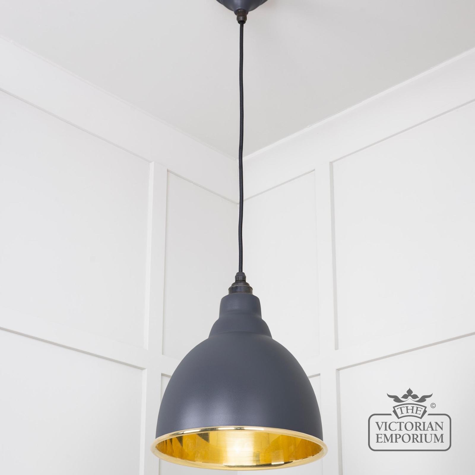 This pendant is hand spun from solid brass and finished in smooth brass with a black fabric cable. With a Slate painted exterior.