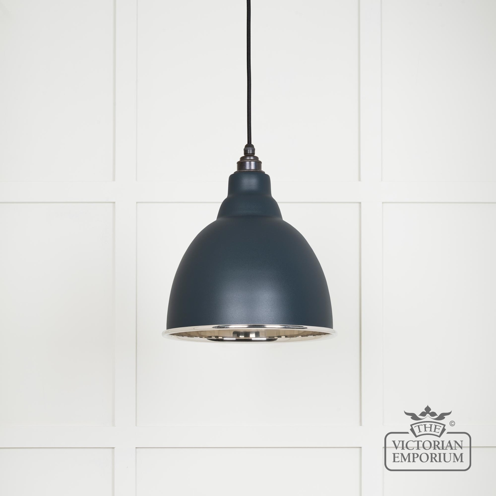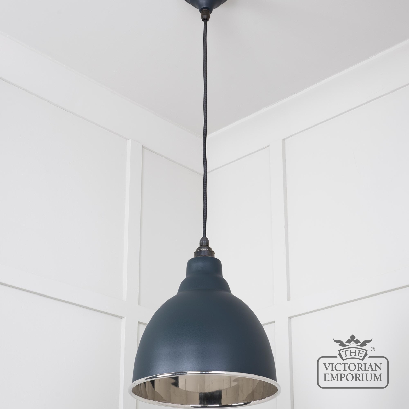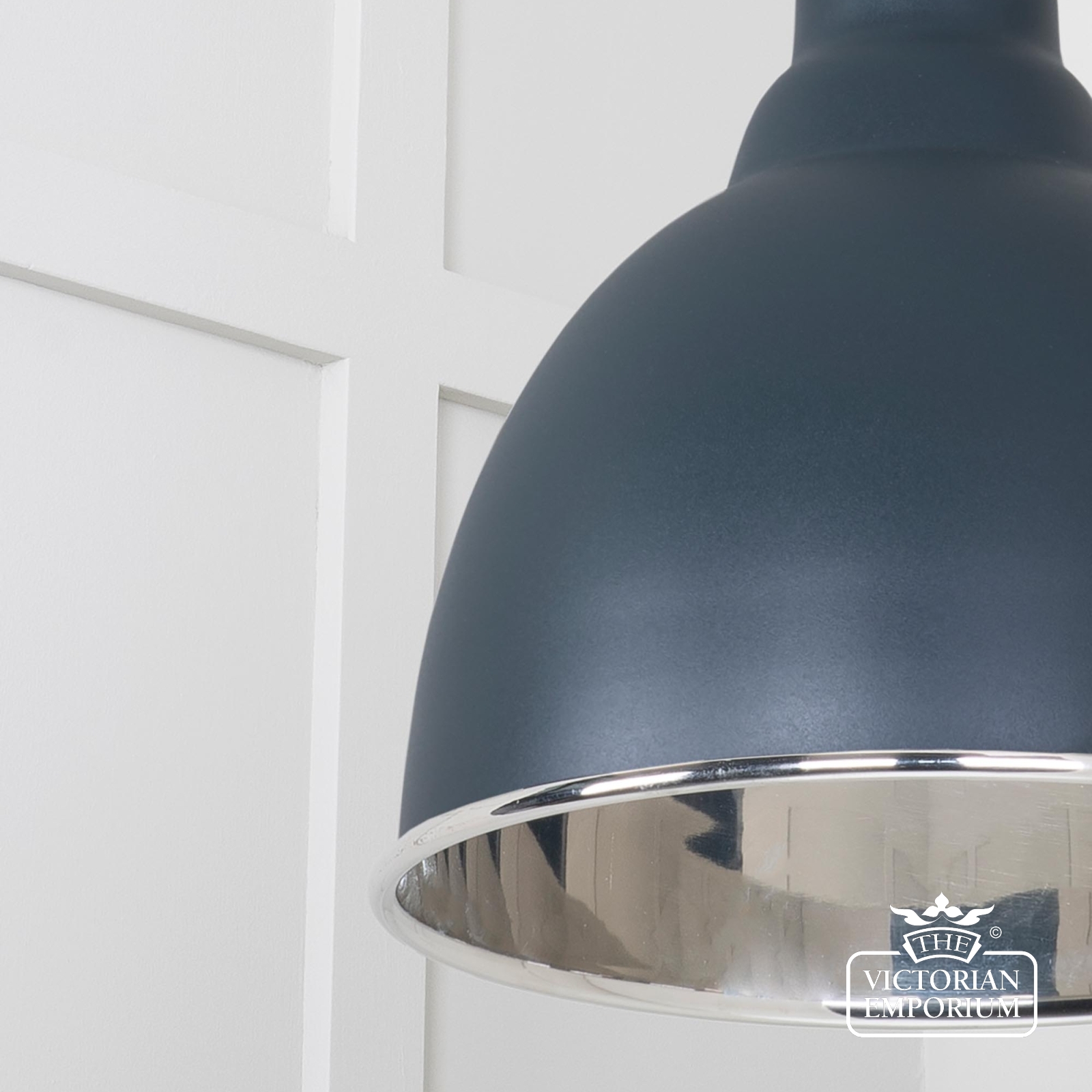 This pendant is hand spun from solid brass and finished in smooth nickel with a black fabric cable - looks great in a group.