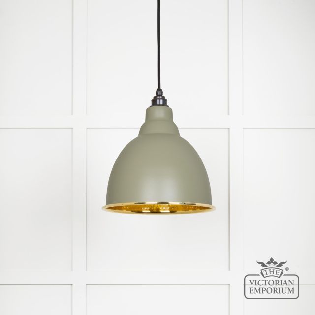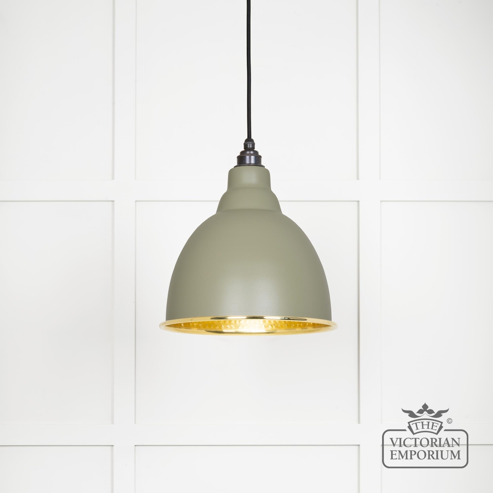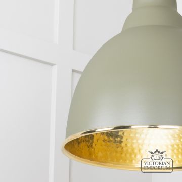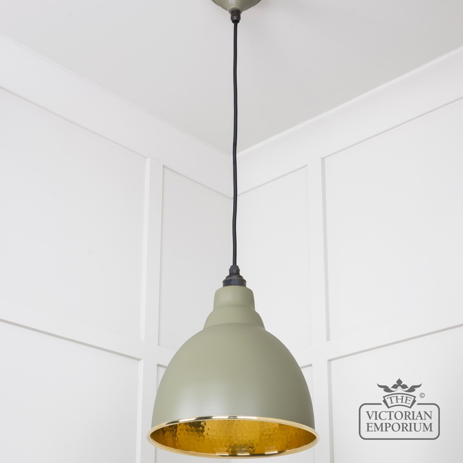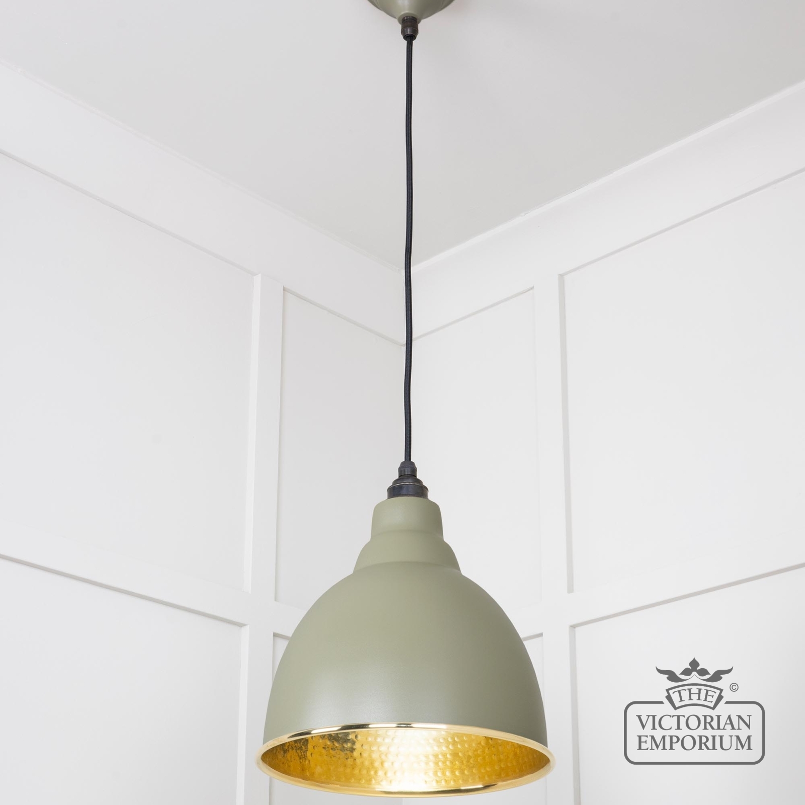 This pendant is hand spun from solid brass and finished in hammered brass and Tump painted exterior with a black fabric cable. This one has a beautiful hammered brass interior and a Tump exterior