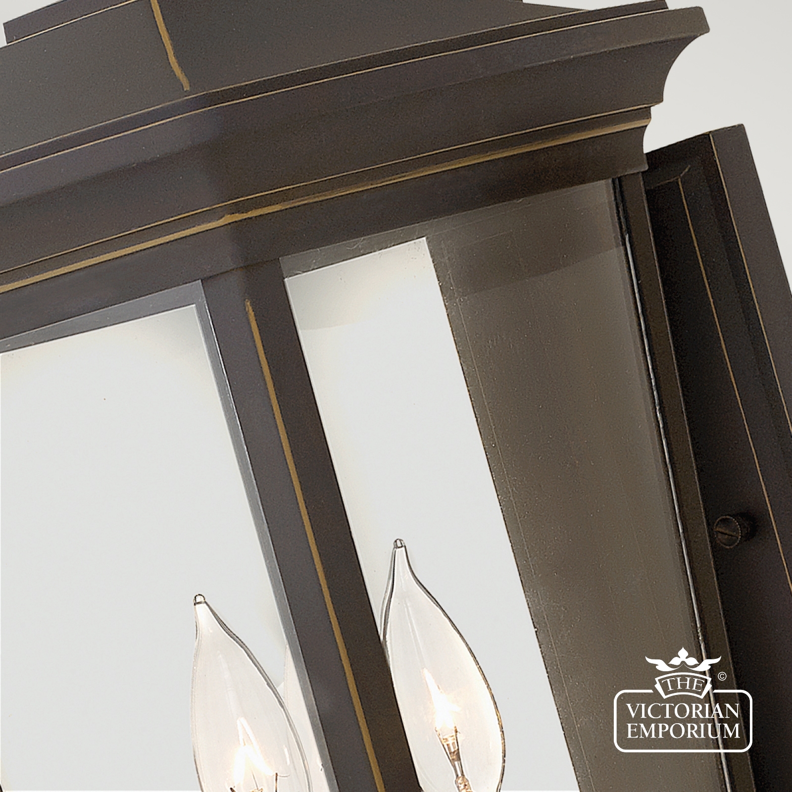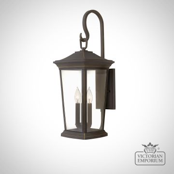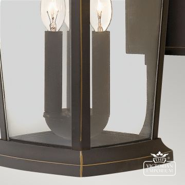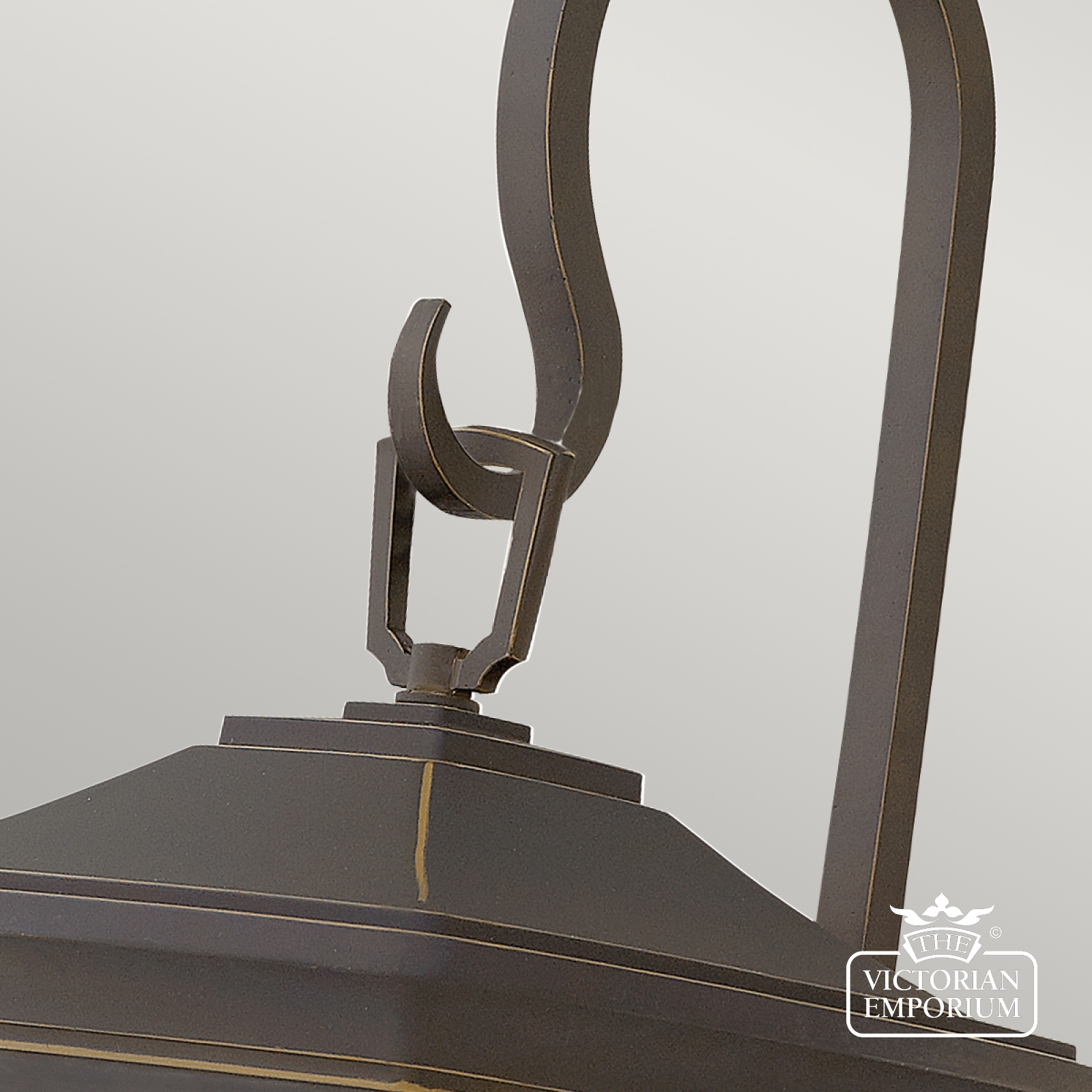This is a traditional wall lantern design with elegant and stately details fabricated from die cast aluminium with a shephards hook style scrolled arm, top finial detail