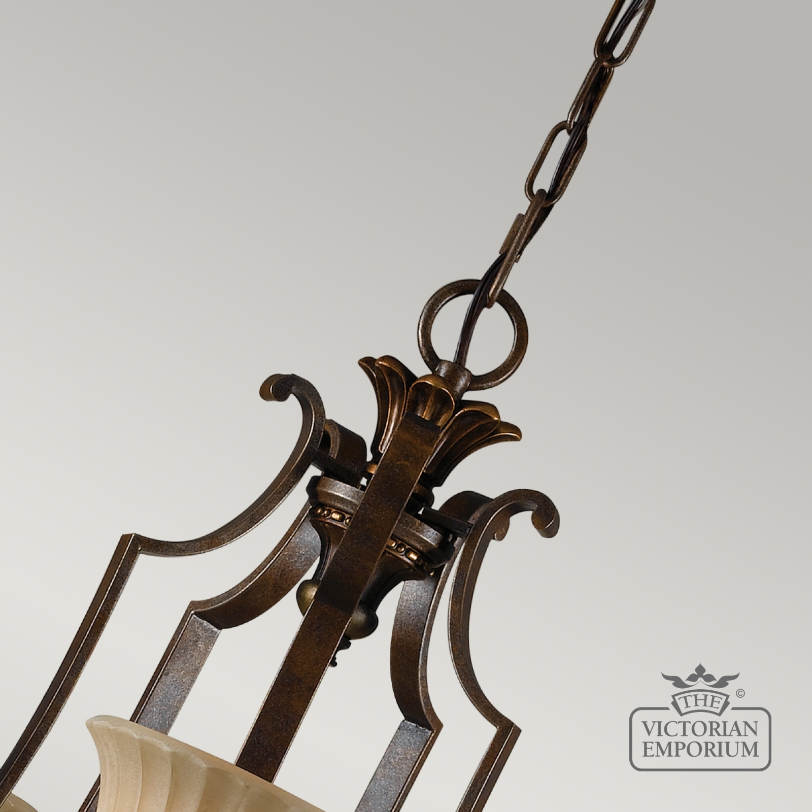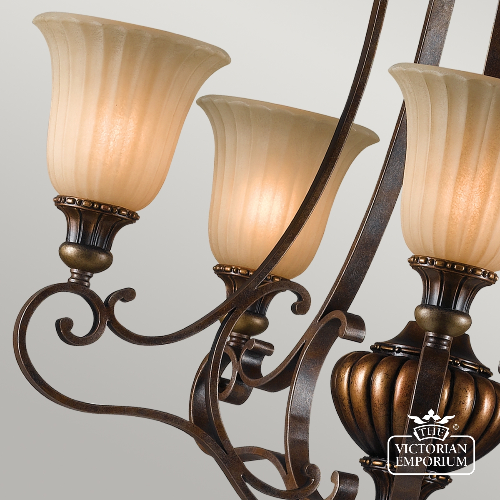 This beautiful chandelier is composed of a structure coloured gold and bronze and Indian Scavo Glass giving a distinctive warm colour.
