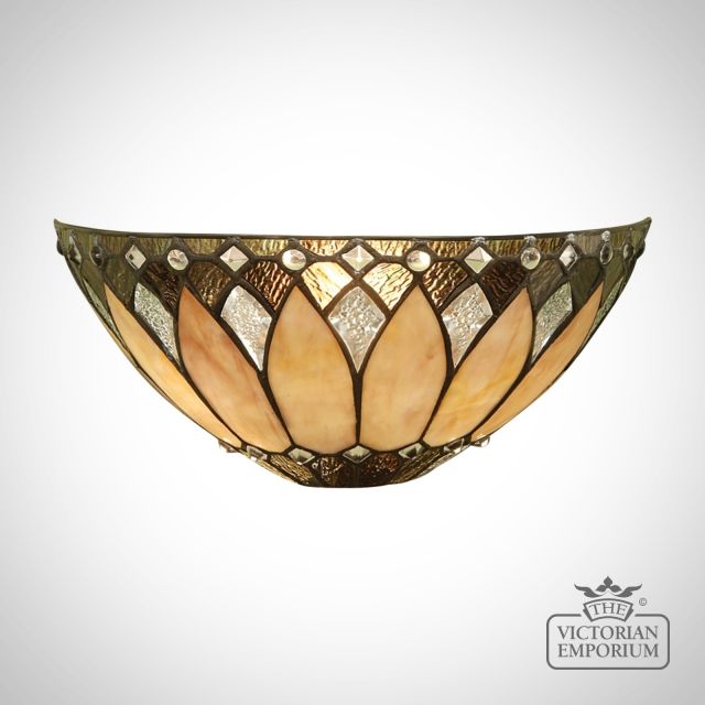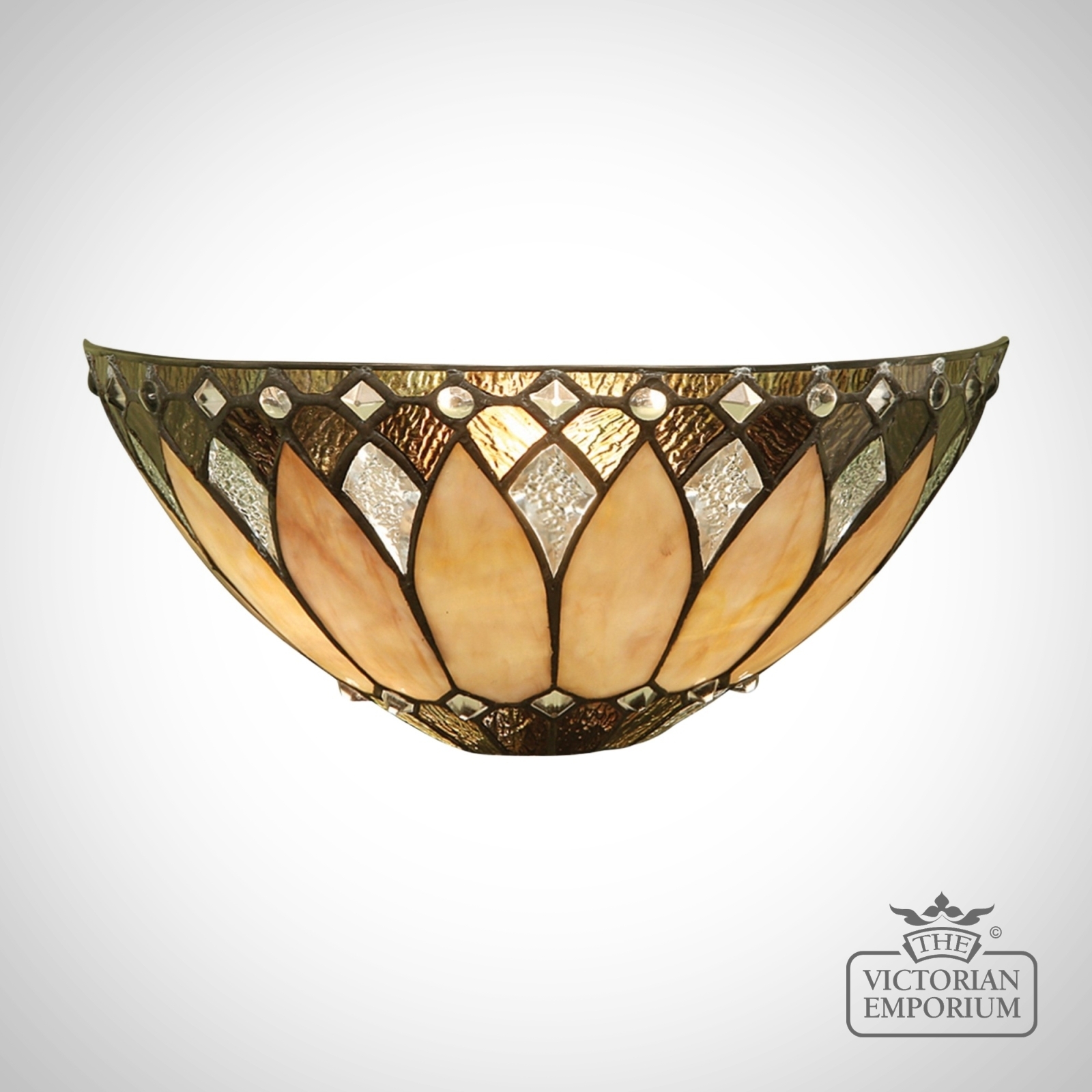 The Tiffany Brooklyn wall light features an eyecatching shape, bevelled and textured glass combined with rich cream art glass creating a striking finish