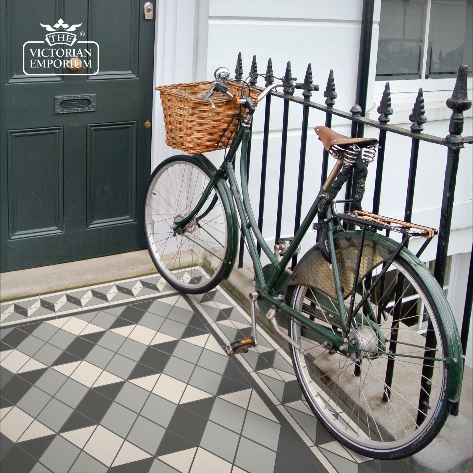 Victorian mosaic pattern tiles in Victorian colour pallet of beige, black and grey - sold by the sheet.