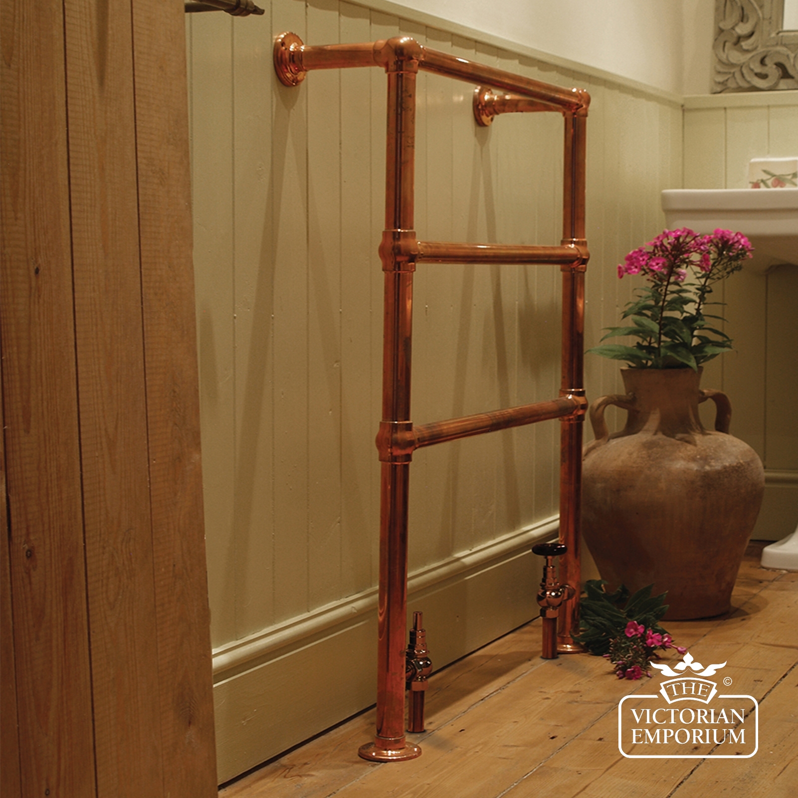 Very simple floor mounted mild steel towel rail, in a chrome or copper finish. Good quality value for money towel rail
