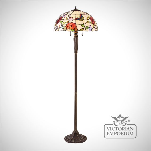 The Butterfly floor light is a traditional Tiffany design combining flowers and colourful butterflies, made from art glass and teamed with a bronze effect trim