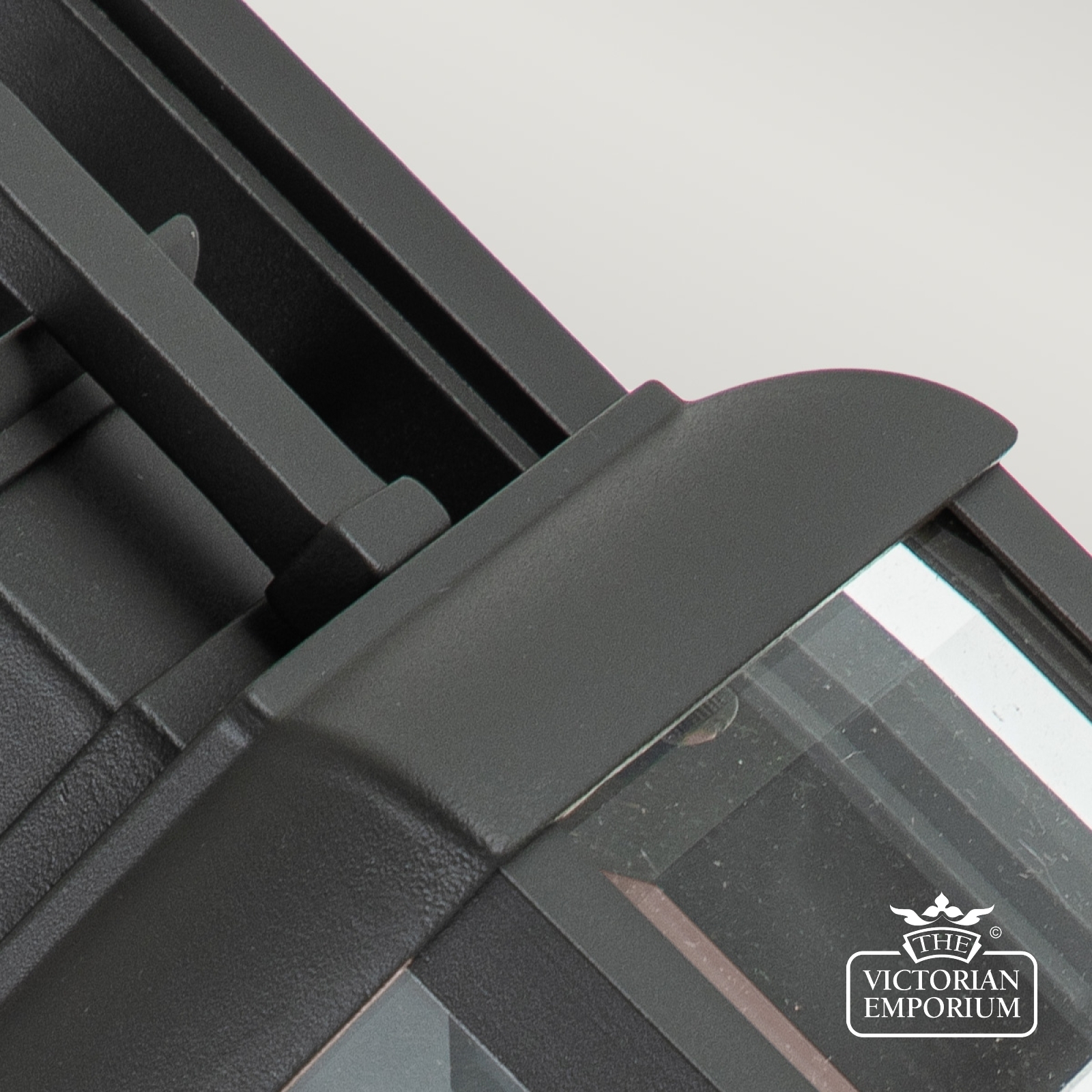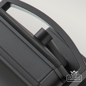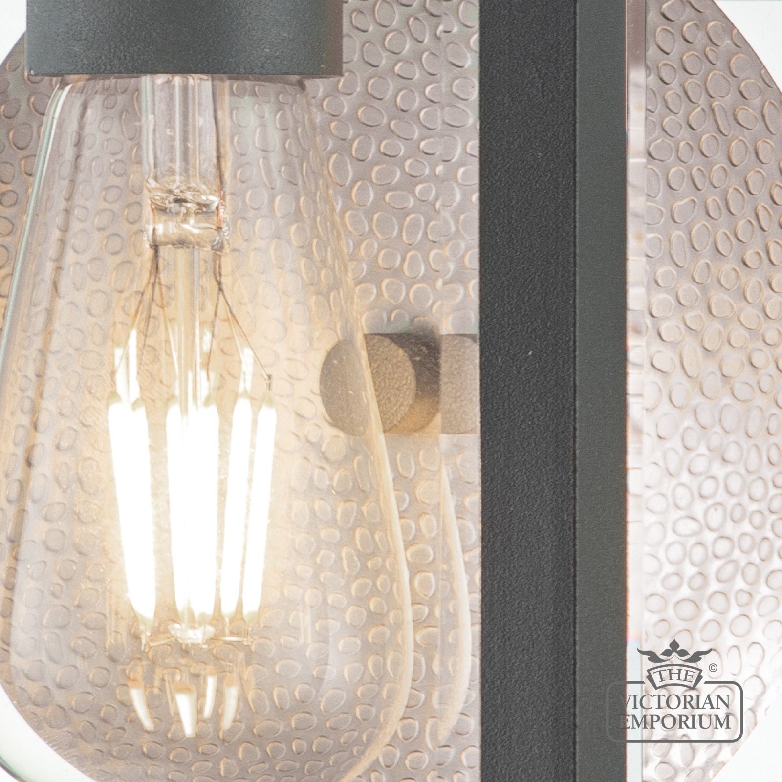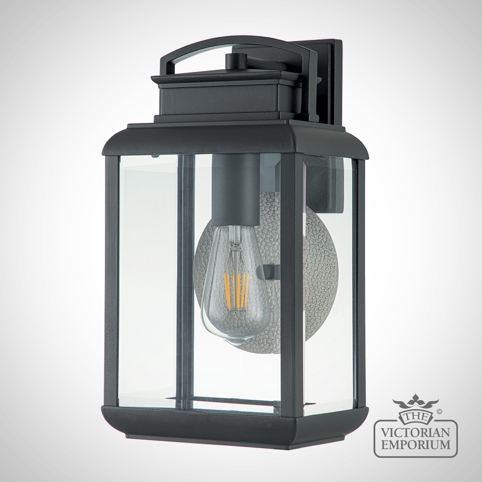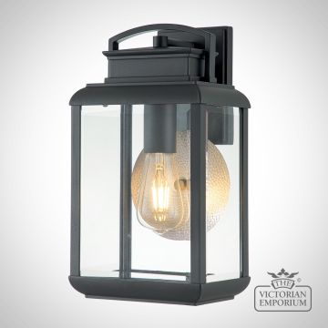 Medium wall lantern to enhance Victorian houses. With a vintage bulb for a historic look and a pewter toned plate behind it. The clear bevelled glass and the Graphite finish complete the look