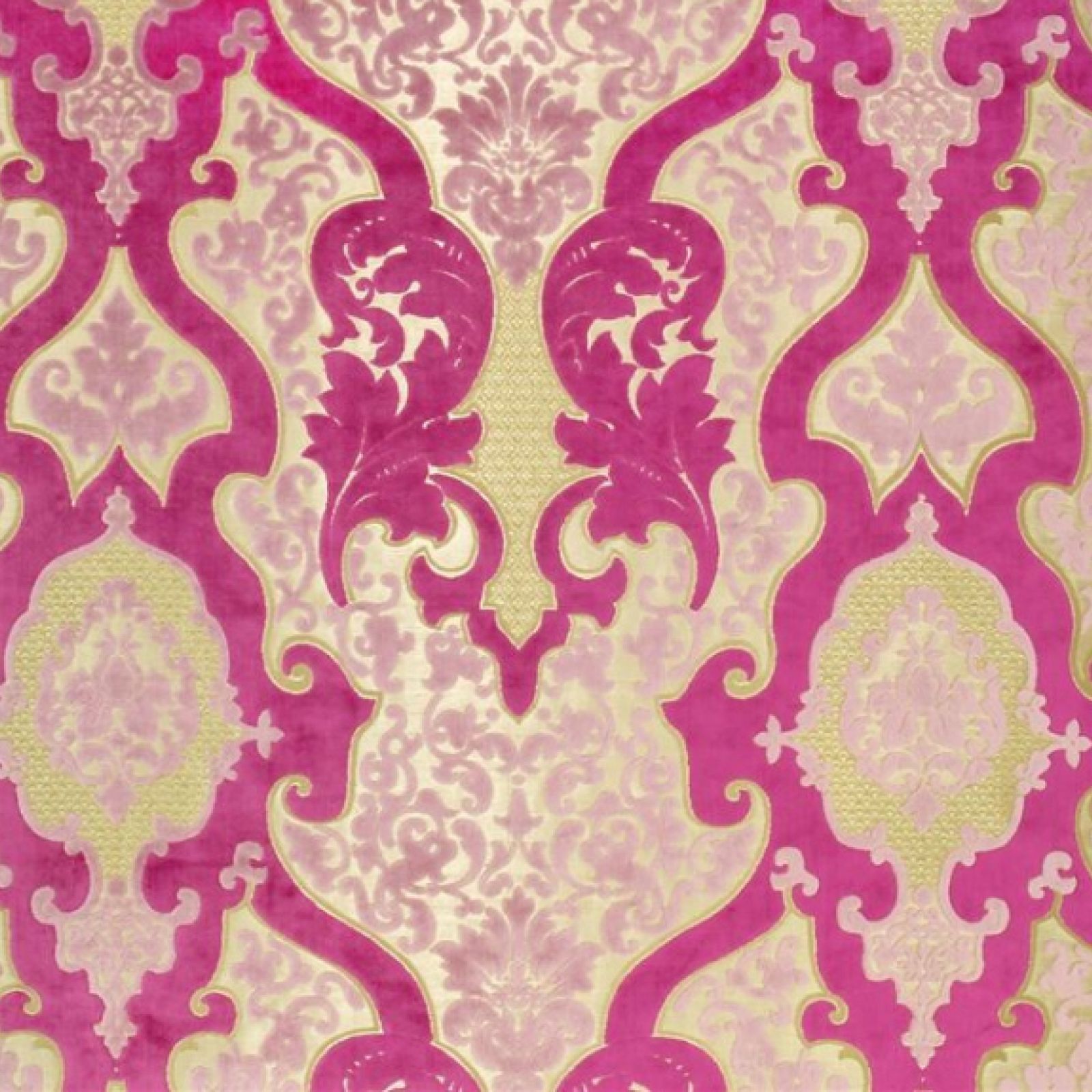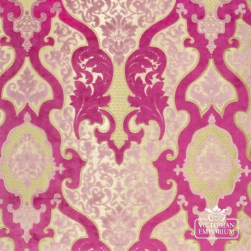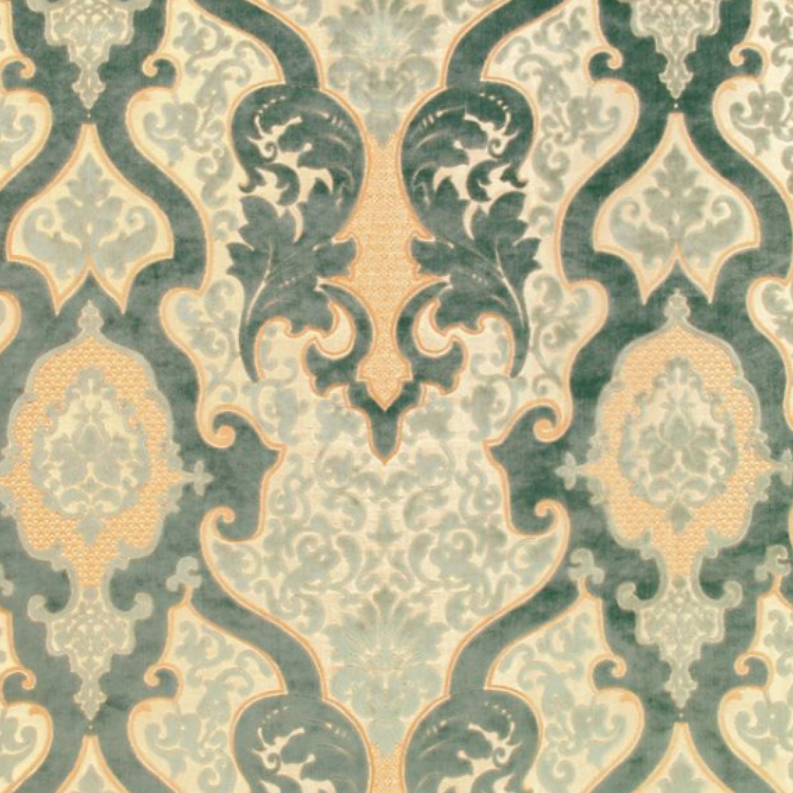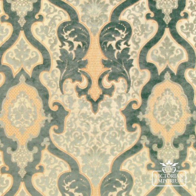 A classic rococo pattern in a luxurious cut velvet quality, woven on a shimmering jaquard woven ground