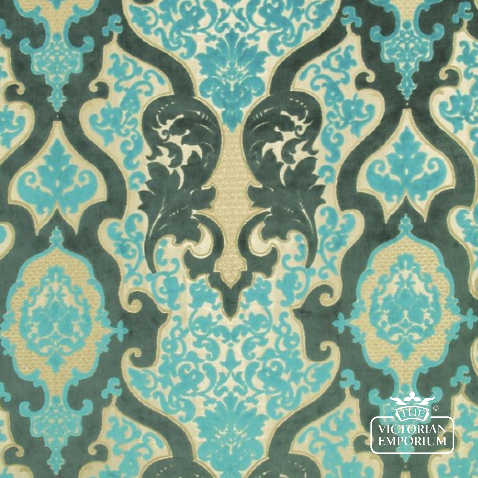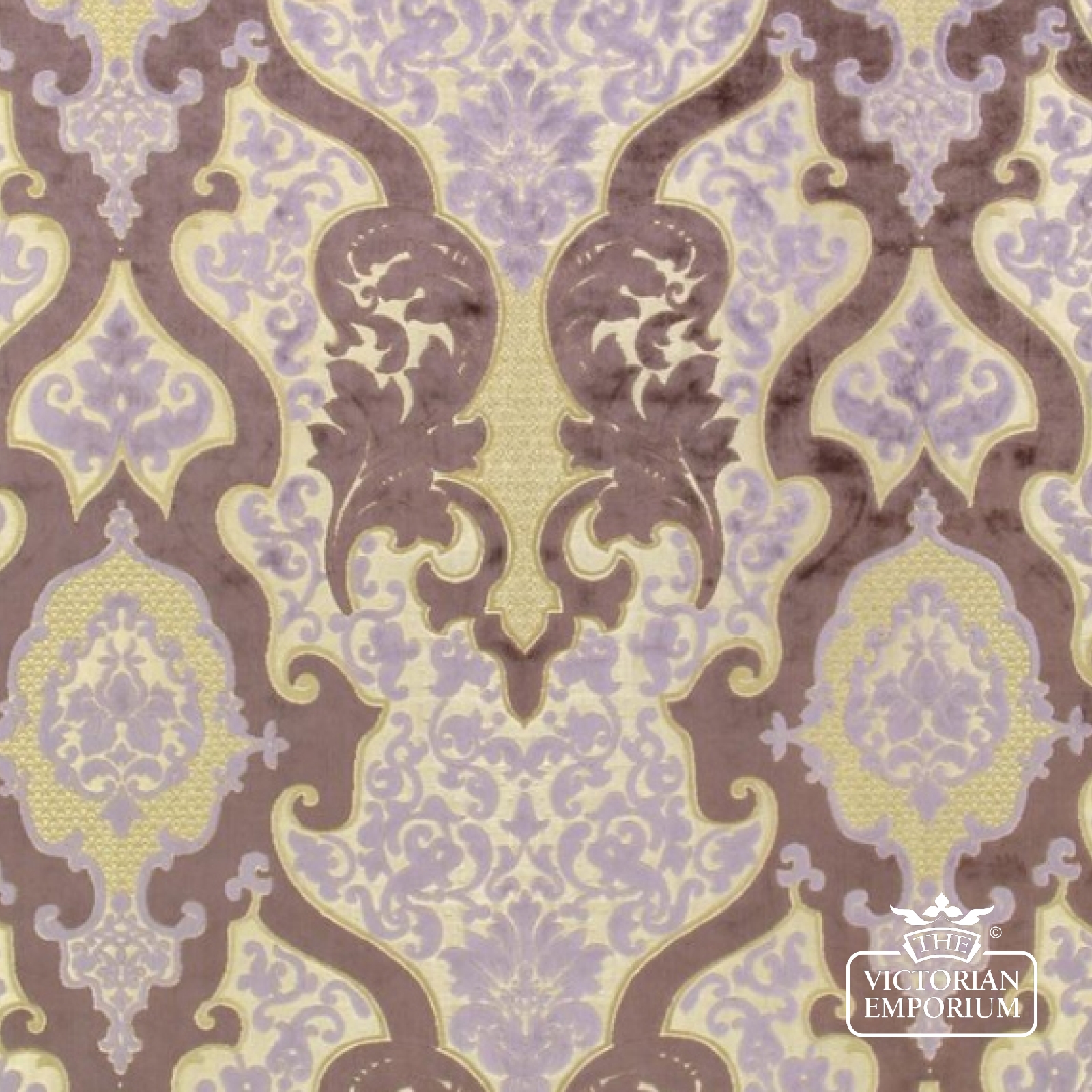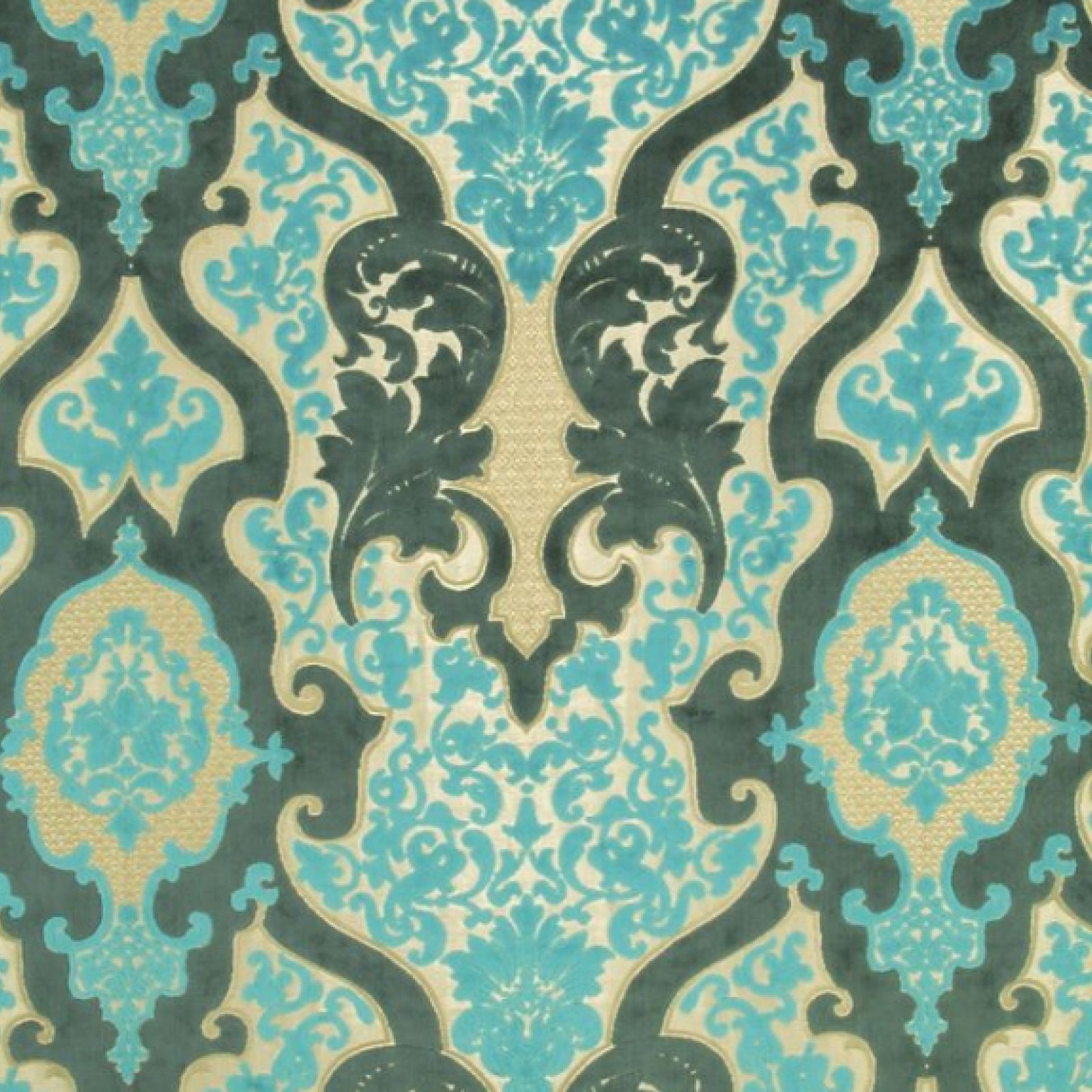 A classic rococo pattern in a luxurious cut velvet quality, woven on a shimmering jaquard woven ground