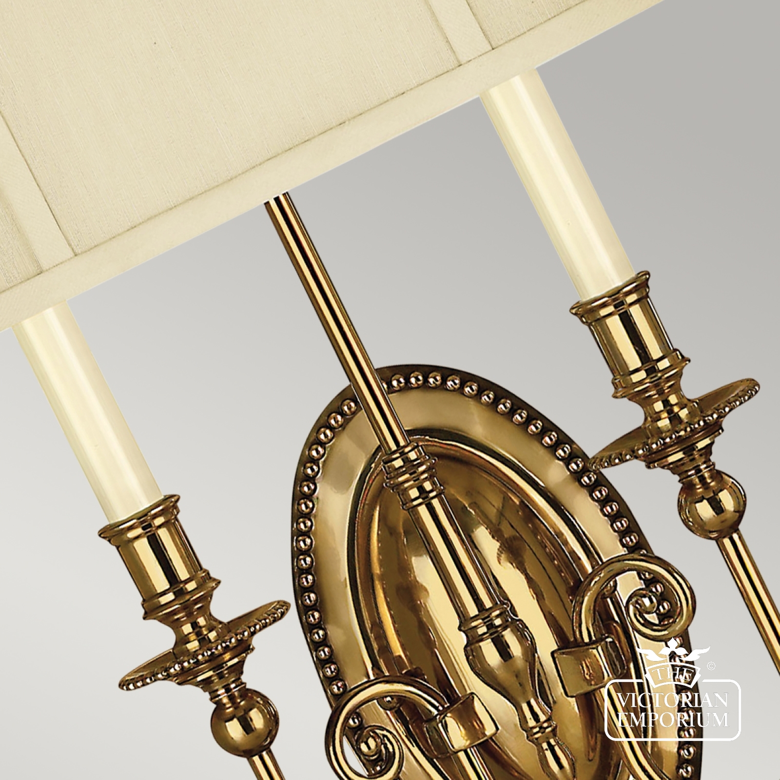 Solid brass construction in a Burnished Brass finish. The solid cast components, brass turnings, beaded ball fonts and clear optic glass reinforce its timeless style, and this beautiful wall light features a large shade