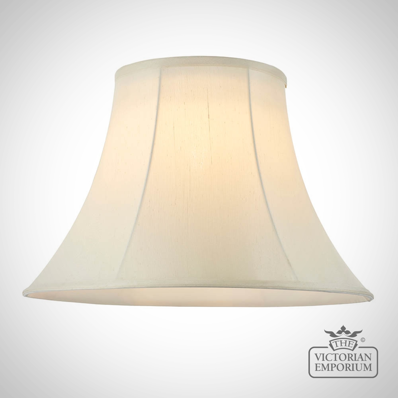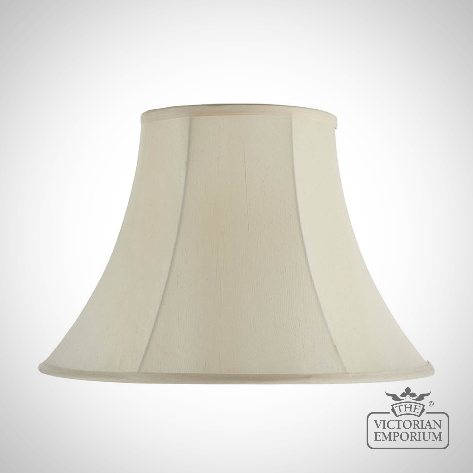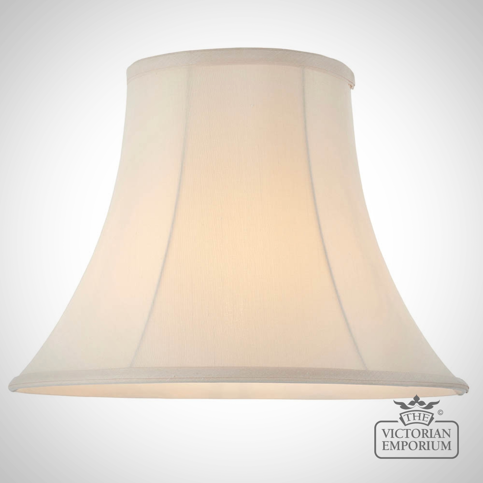 This handmade cream lamp shade is shaped in a round bell design and has a double folded trim on the top and bottom. For use with a variety of lamp bases and available in a choice of sizes
