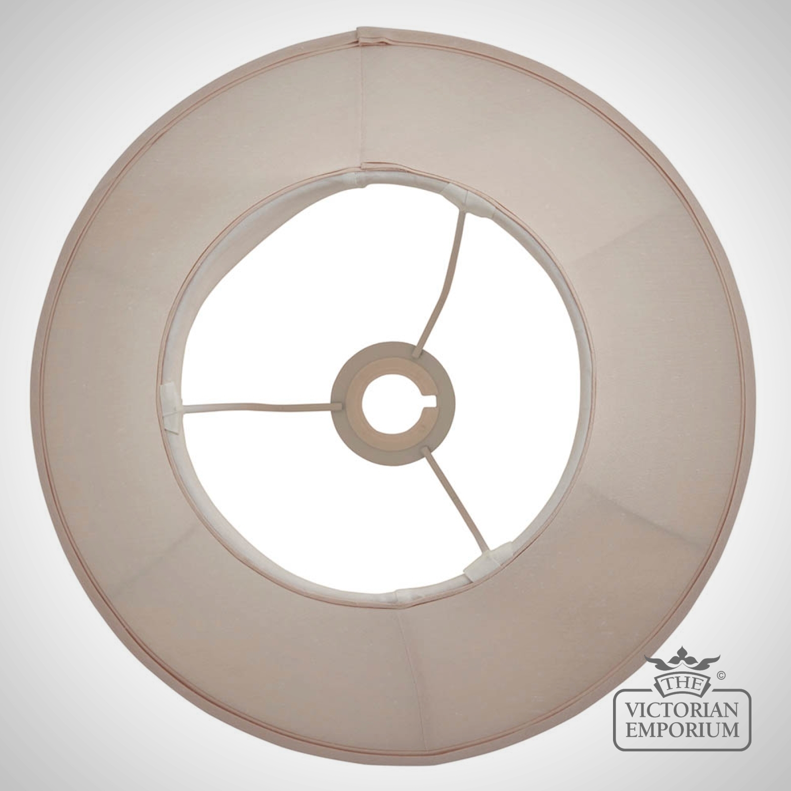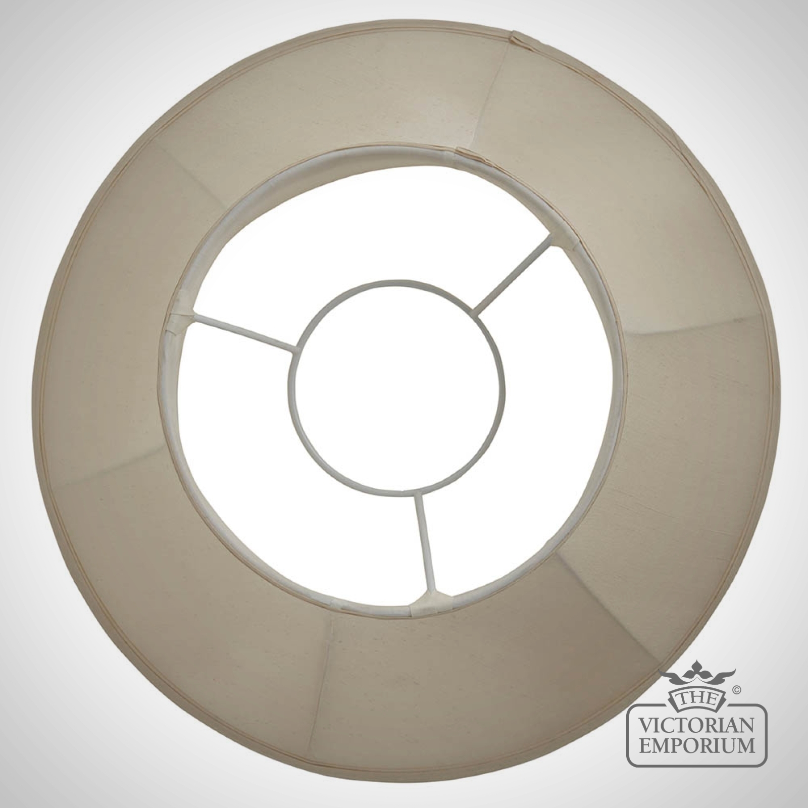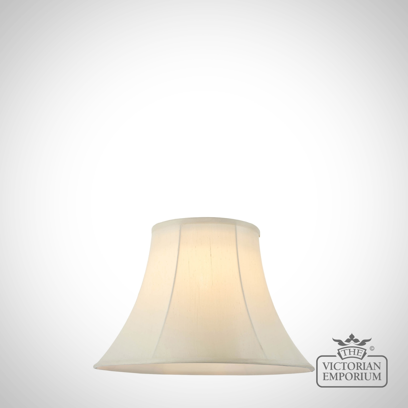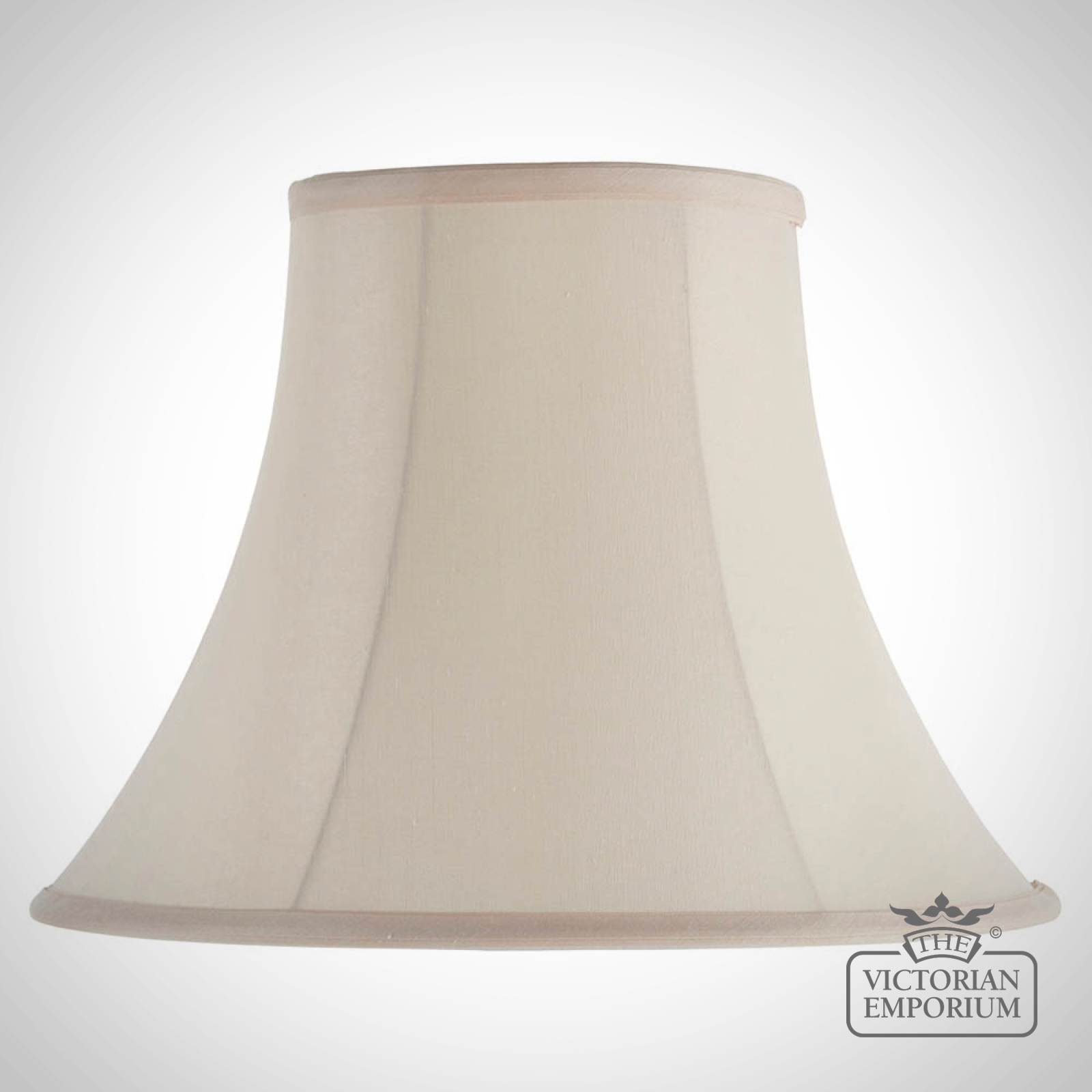 This handmade cream lamp shade is shaped in a round bell design and has a double folded trim on the top and bottom. For use with a variety of lamp bases and available in a choice of sizes