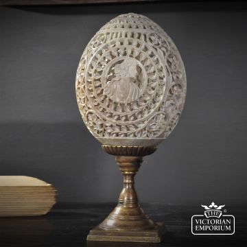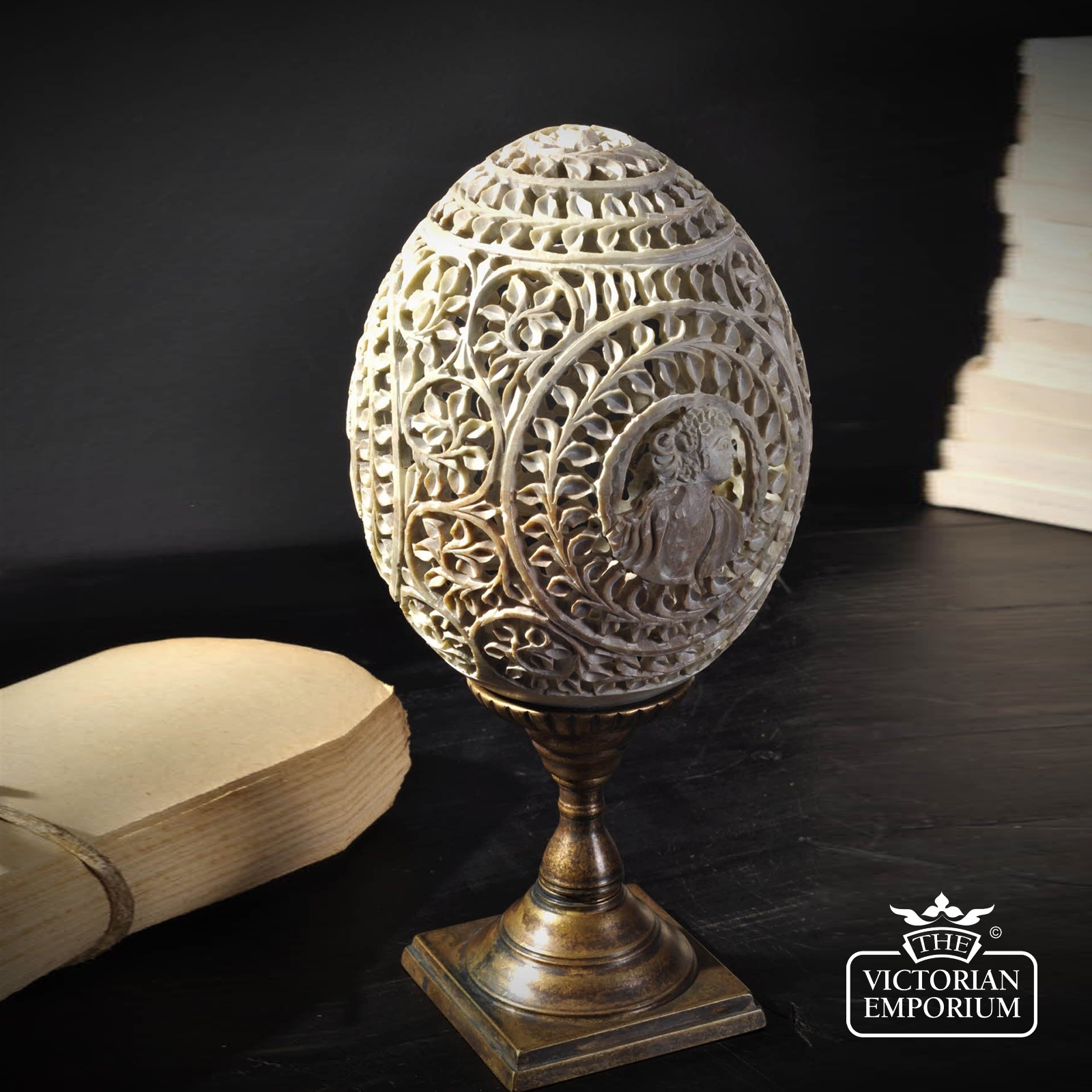 Magnificent engraved egg made from carved stone with cameo lace pattern on a solid brass stand