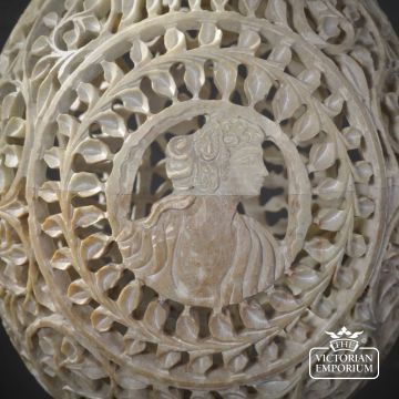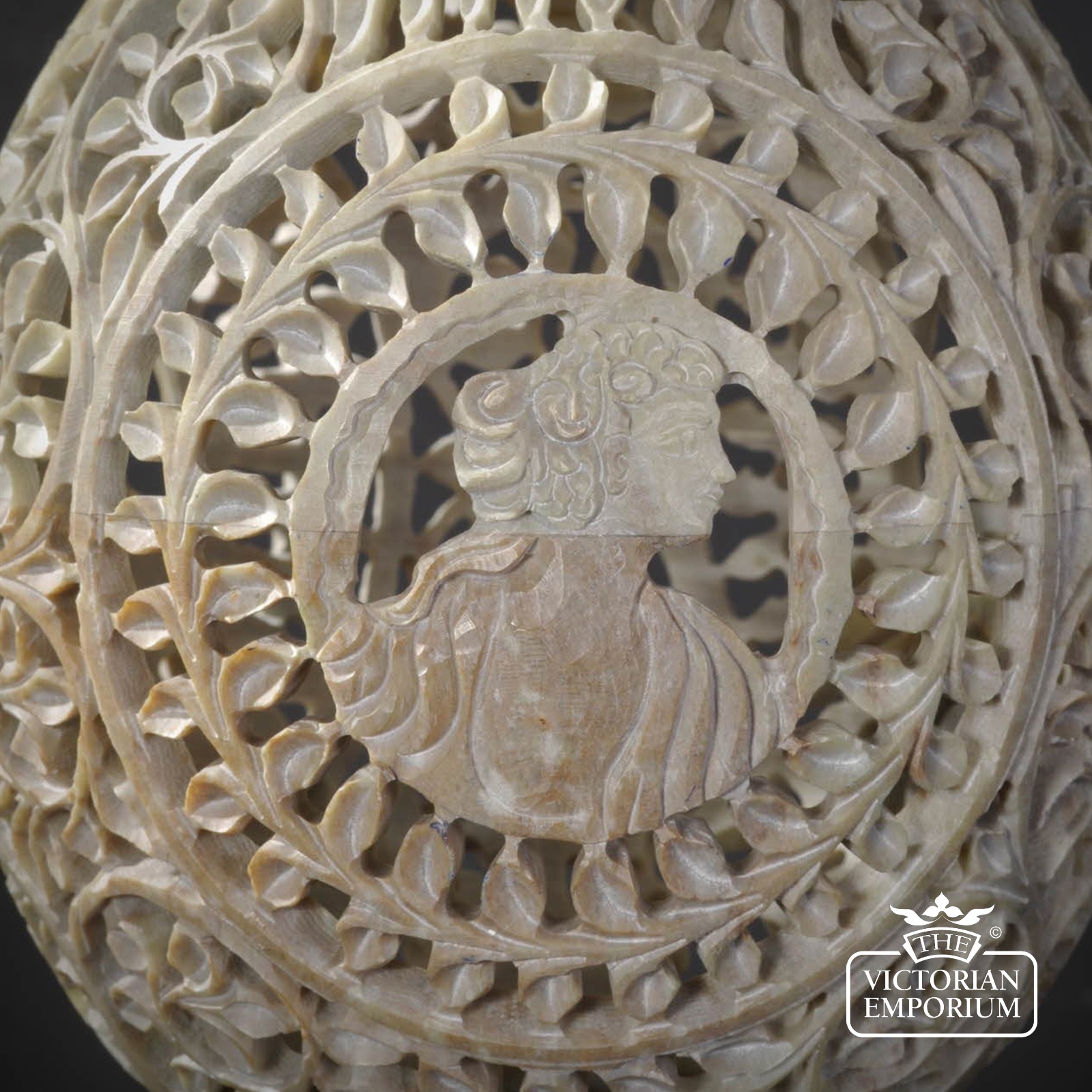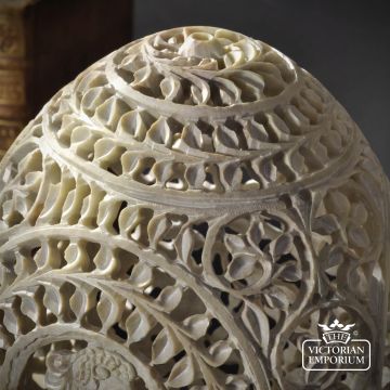 This is an egg shape made from stone (steatite), engraved with a vegetable and cameo lace pattern on a solid brass stand.