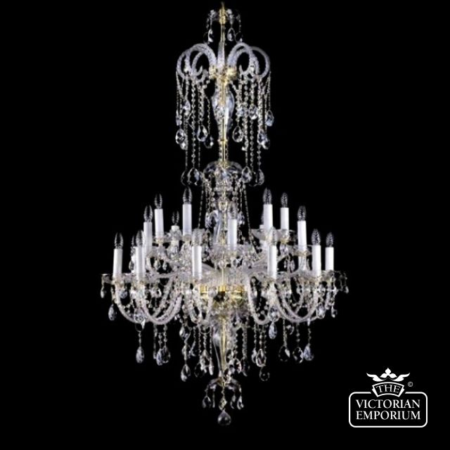 The crystal trimmings on our chandeliers are as follows: Exclusive Bohemian Crystal (Czech republic 30%PbO). The machine cut trimmings are characteristic with a brilliant polish and decompose the light beams in a light spectrum. Preciosa crystal (Czech republic 30%PbO).