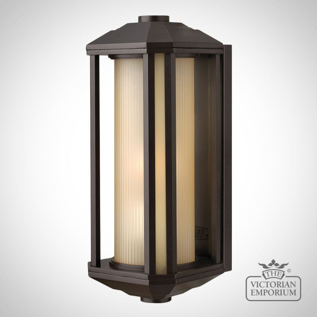 Medium Sized Wall Lantern in sophisticated classic style in a bronze finish with white ribbed etched glass and corner panels. Made from good quality aluminium and Ribbed Etched Glass