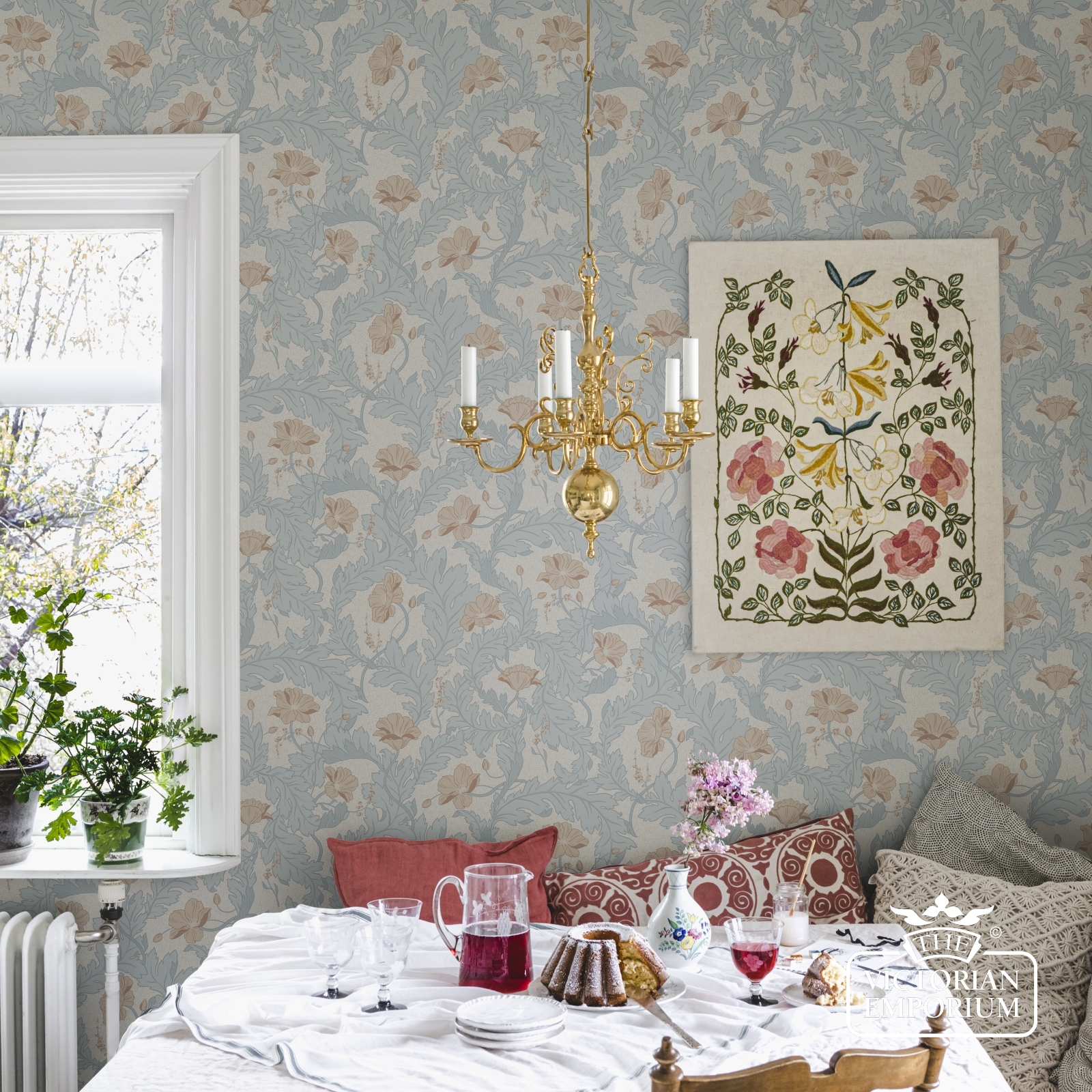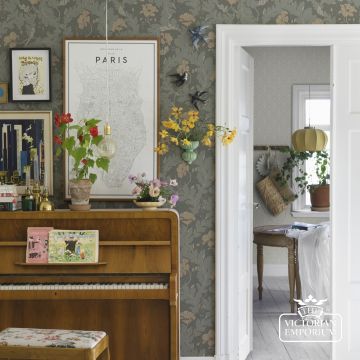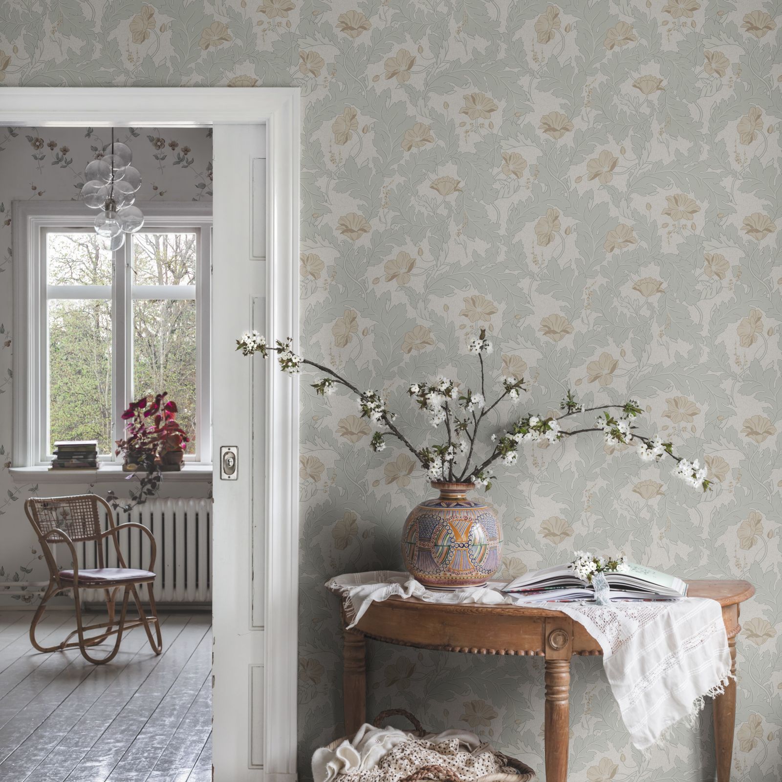 The wallpaper’s four different colourways are all softly coloured.