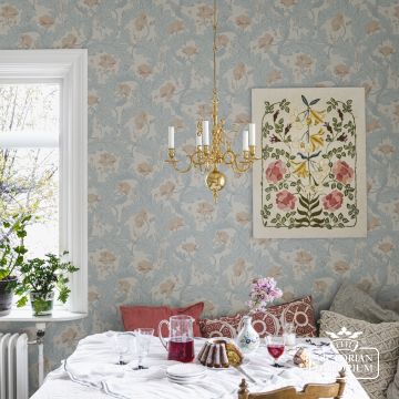 The pattern is inspired by a stunningly designed original wallpaper at Bogesund Castle, coupled with edging in a bedroom.