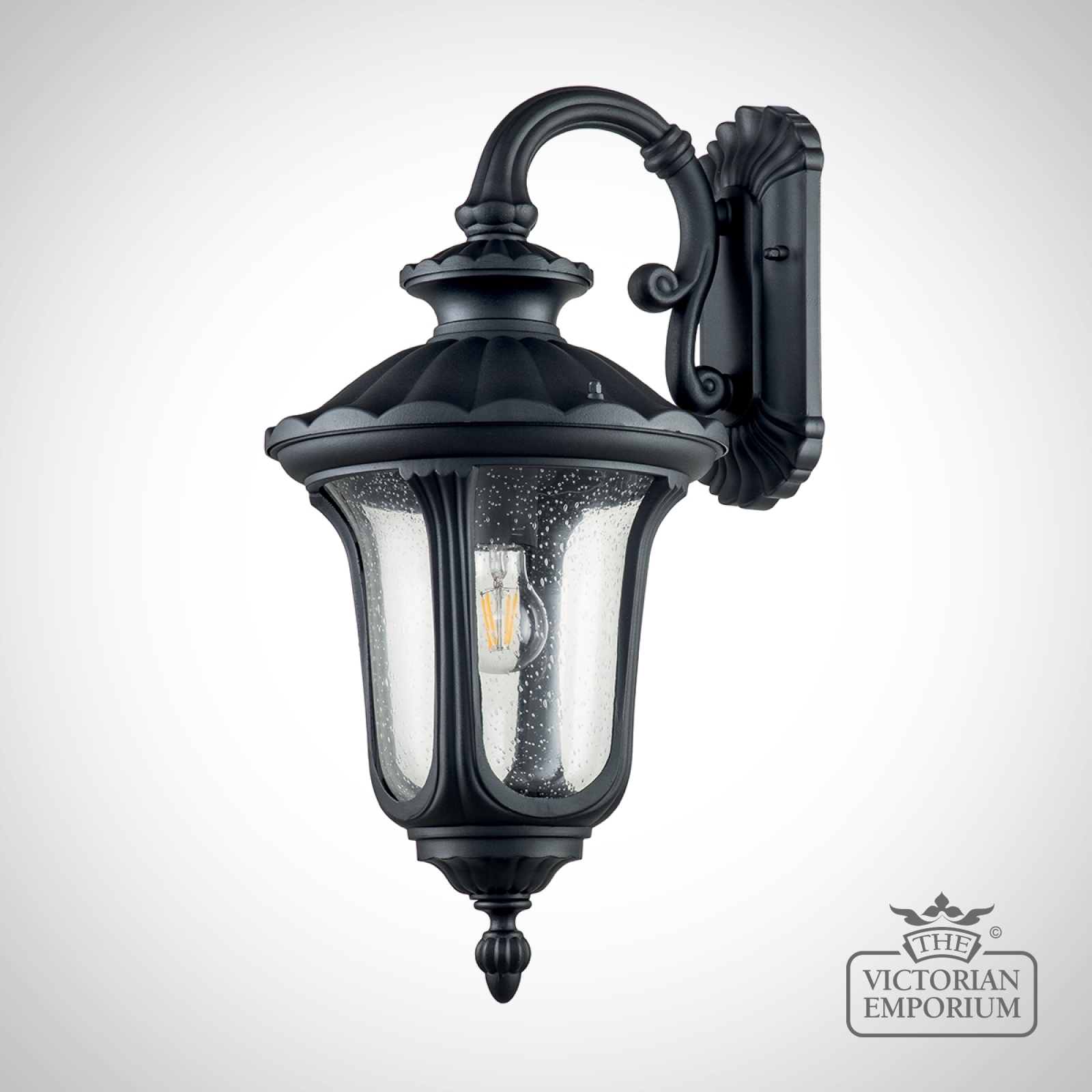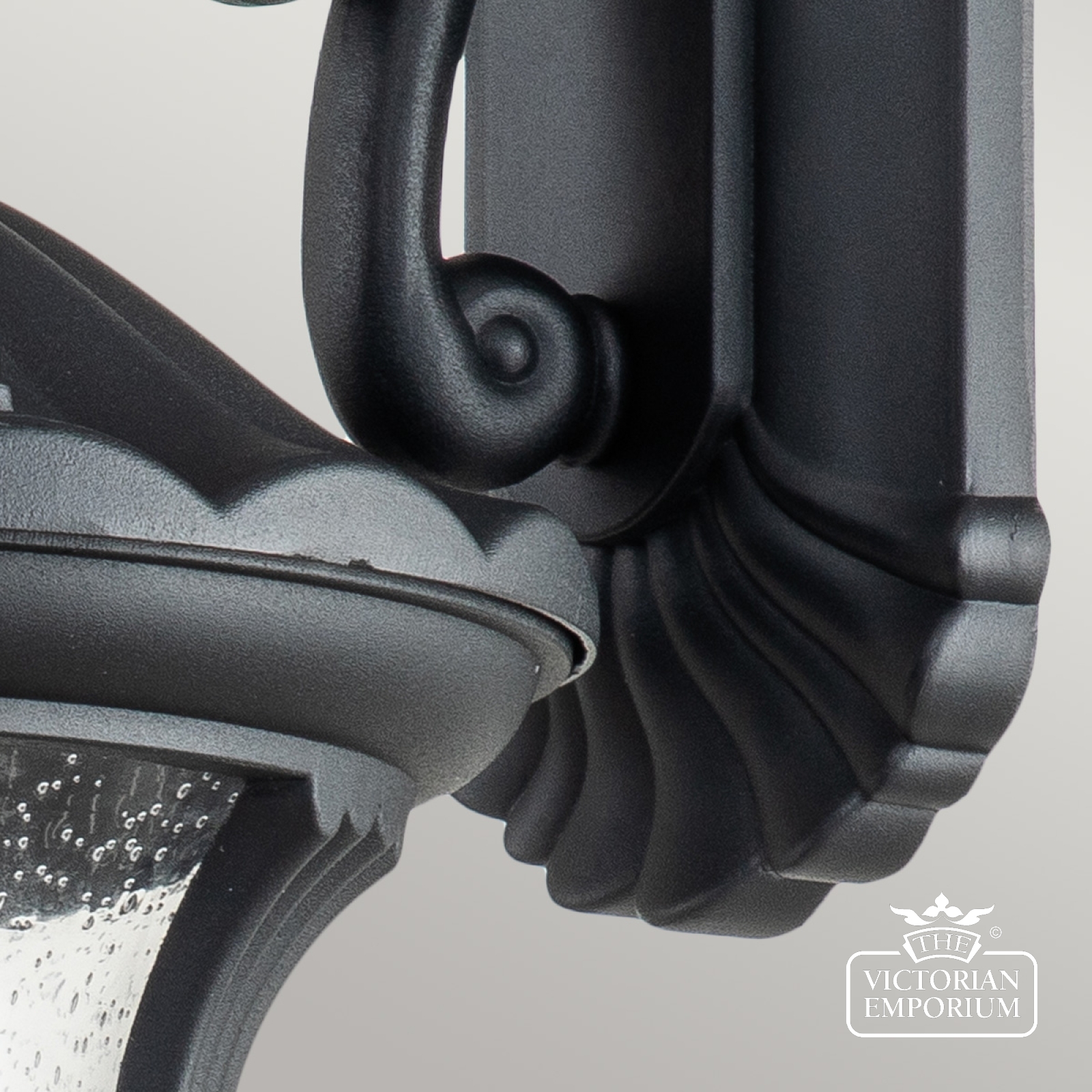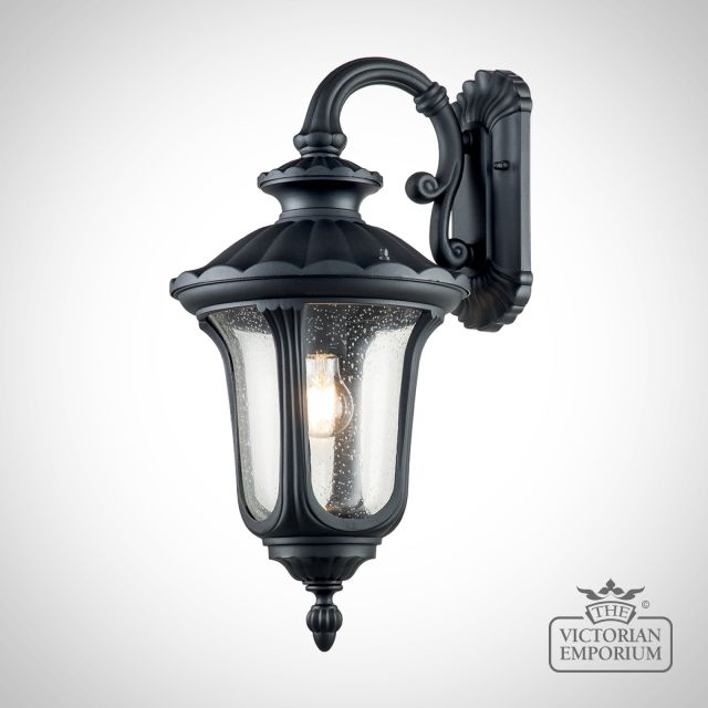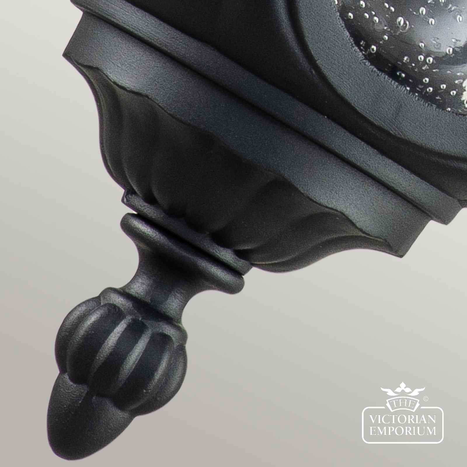 Elegant black wall lantern made from cast aluminium, with clear seeded glass and a matt black finish with a decorative top finial details.