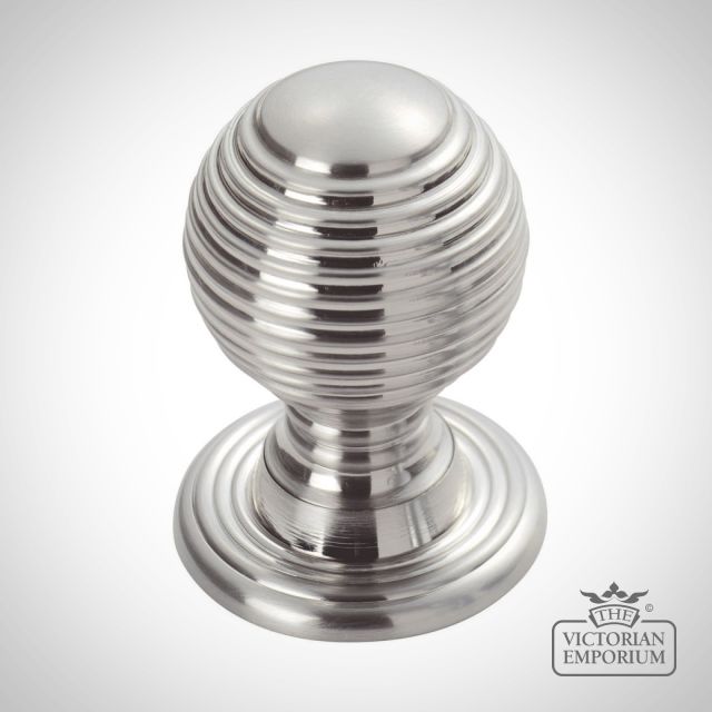 Circular reeded cupboard knob on a matching ringed round rose and stem in a traditional style
