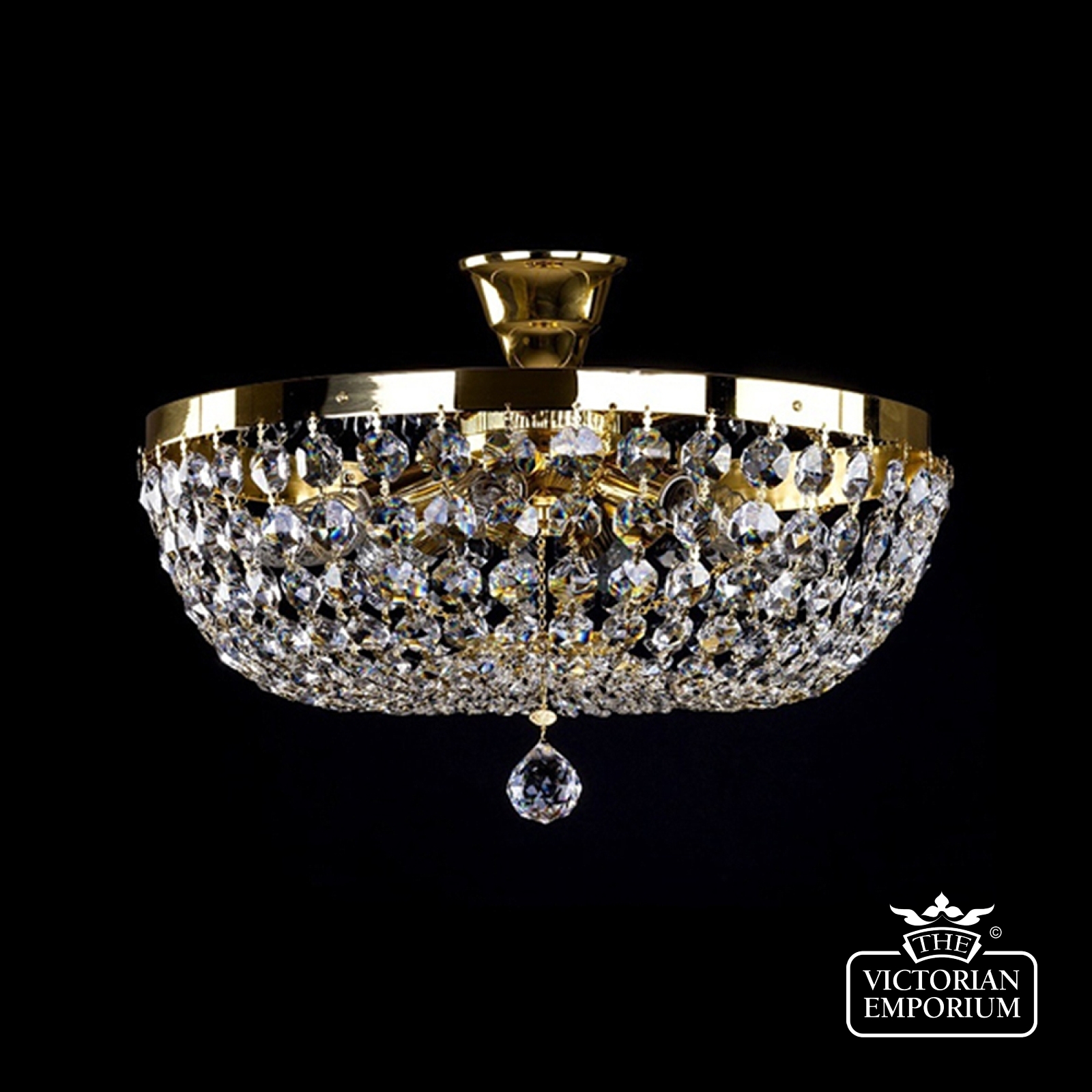 Beautiful basket design for low to standard ceiling heights and medium sized rooms with layers of 30% PbO Bohemian crystal chains which create a wonderful display