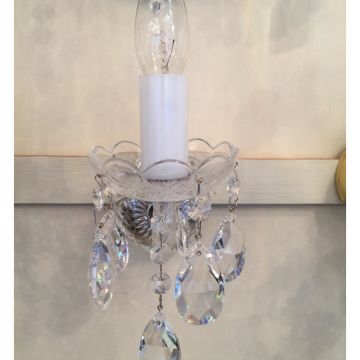 Beautiful single wall sconce with oval shaped 30% PbO crystal oval shape drops, rope twist glass arms, ornate glass bobeches and white glass candle holders
