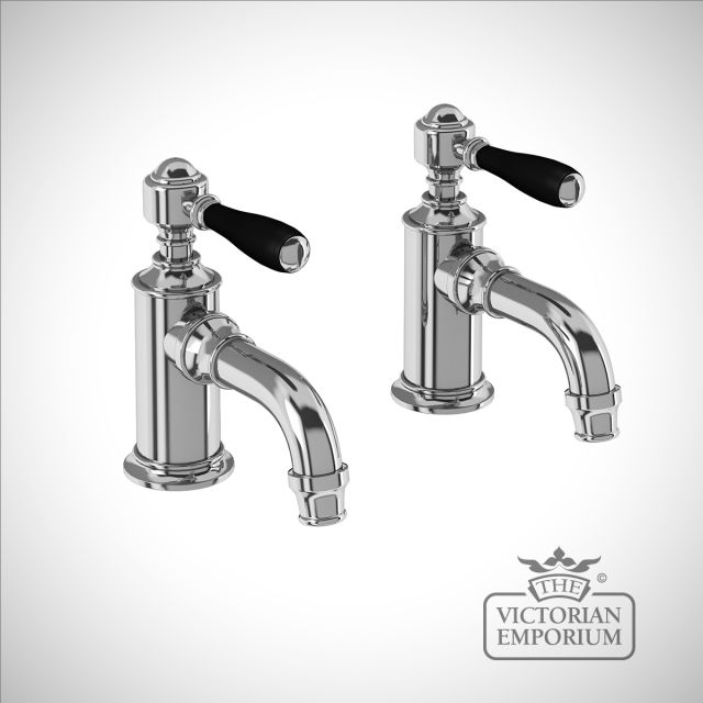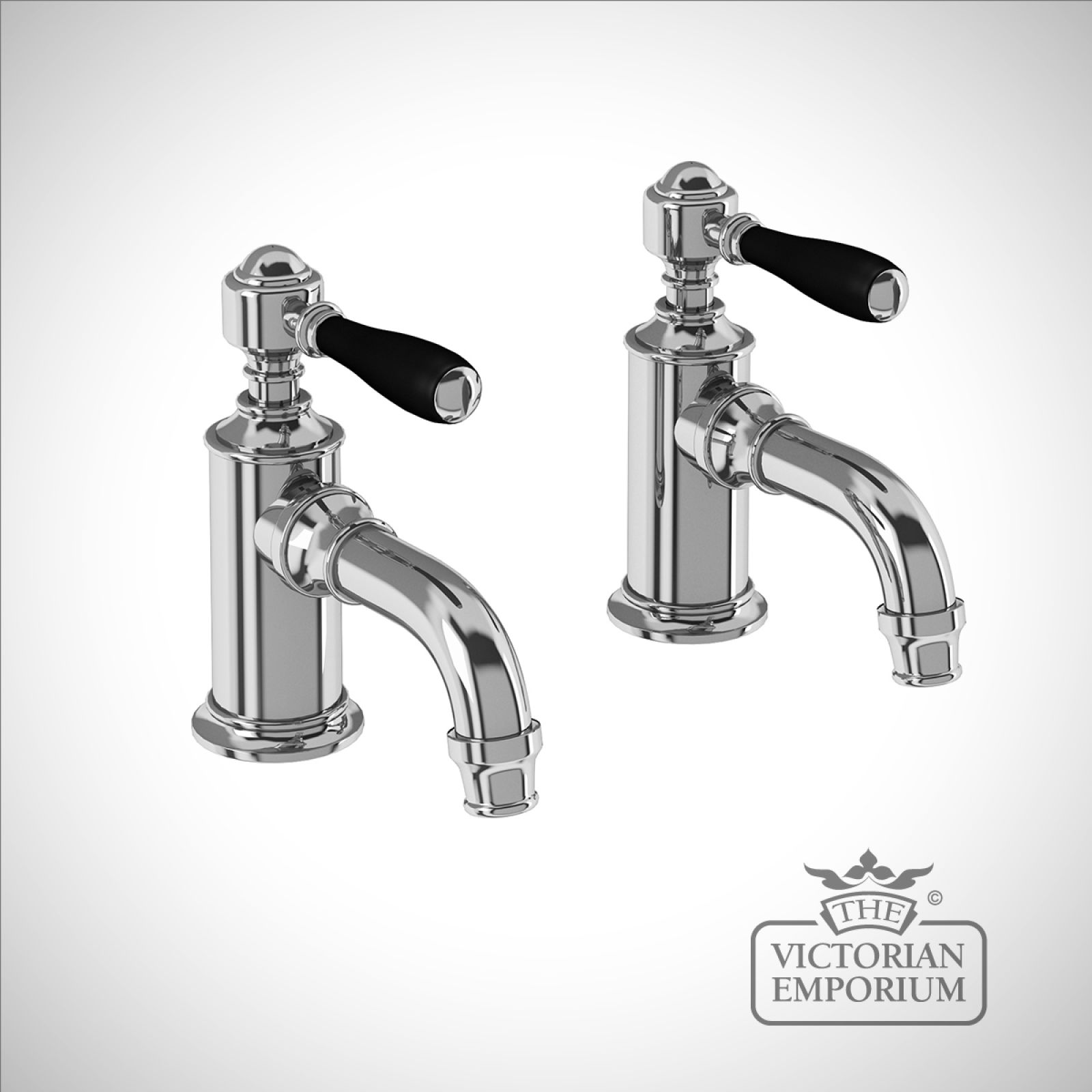 Cloakroom basin pillar taps with black lever in chrome or nickel