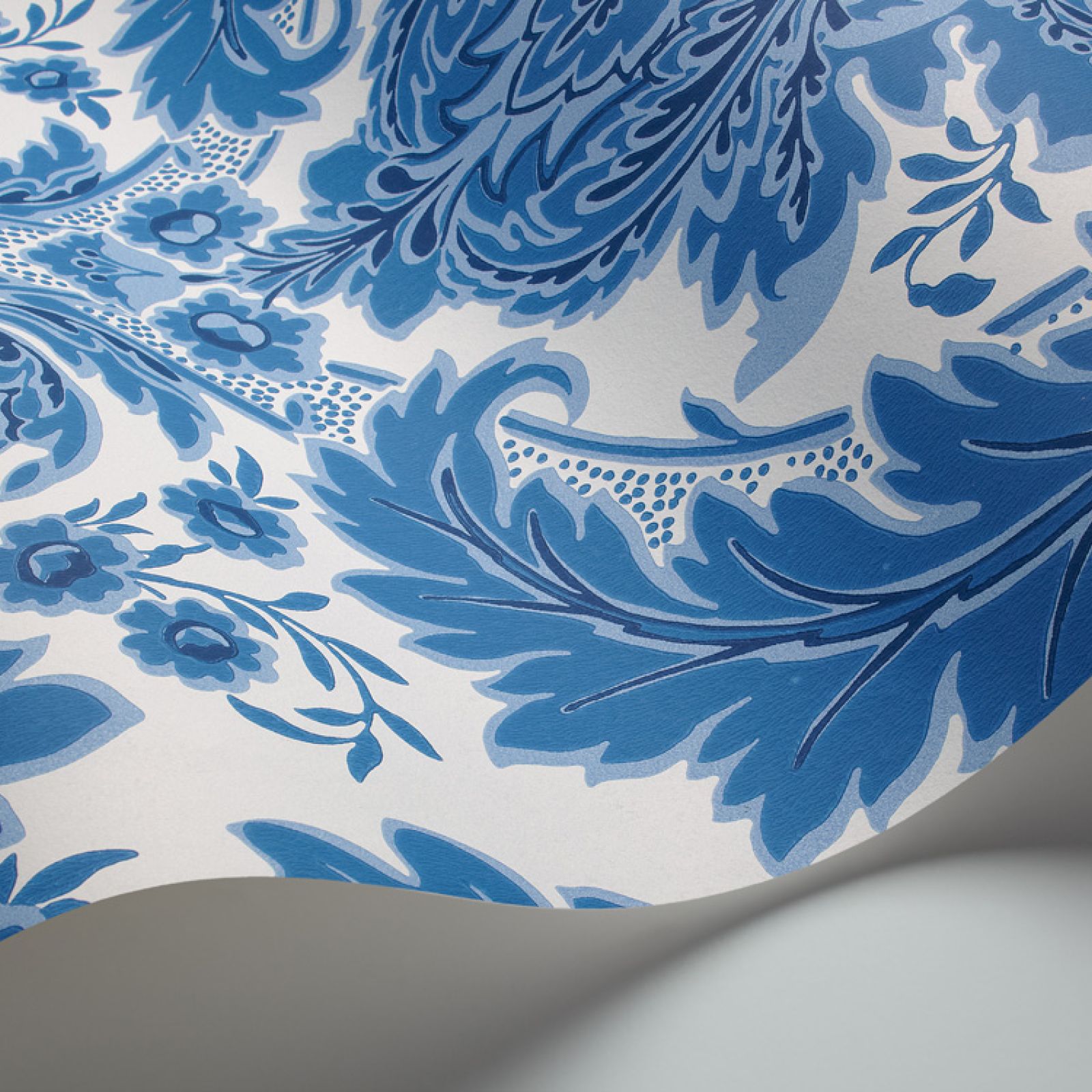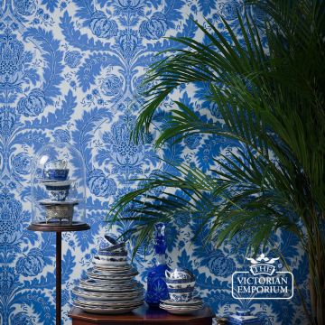 A popular wallpaper design re-coloured in chalky ground shades of stone, white, ochre and camel, with highlights of china blue, leafy green and sooty charcoal. A graceful pattern arrangement of leaves and budding flowers makes up this very handsome damask wallpaper. Available in five colourways.