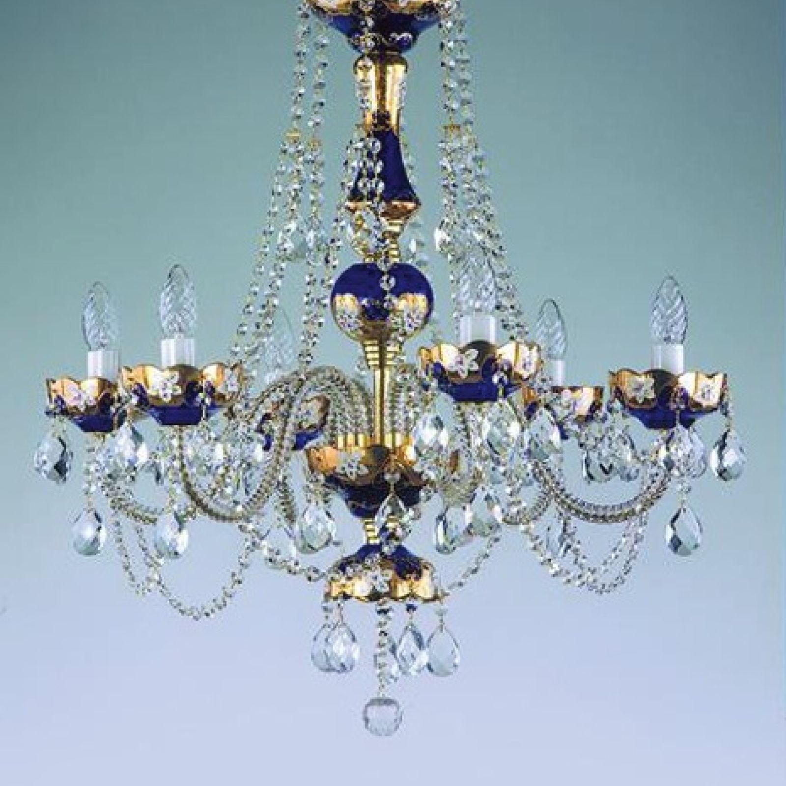 Elegant coloured crystal chandelier, with intricate clay flower details on a gold backdrop
