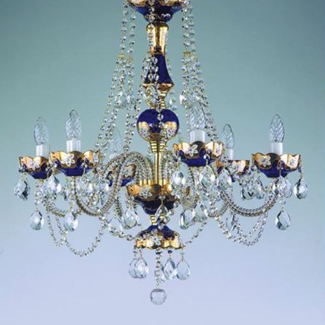 Ornamented with twisted glass arms and delicate 30% lead crystal trimmings. Available in a range of colours and suitable for standard to higher ceilings and medium sized rooms.